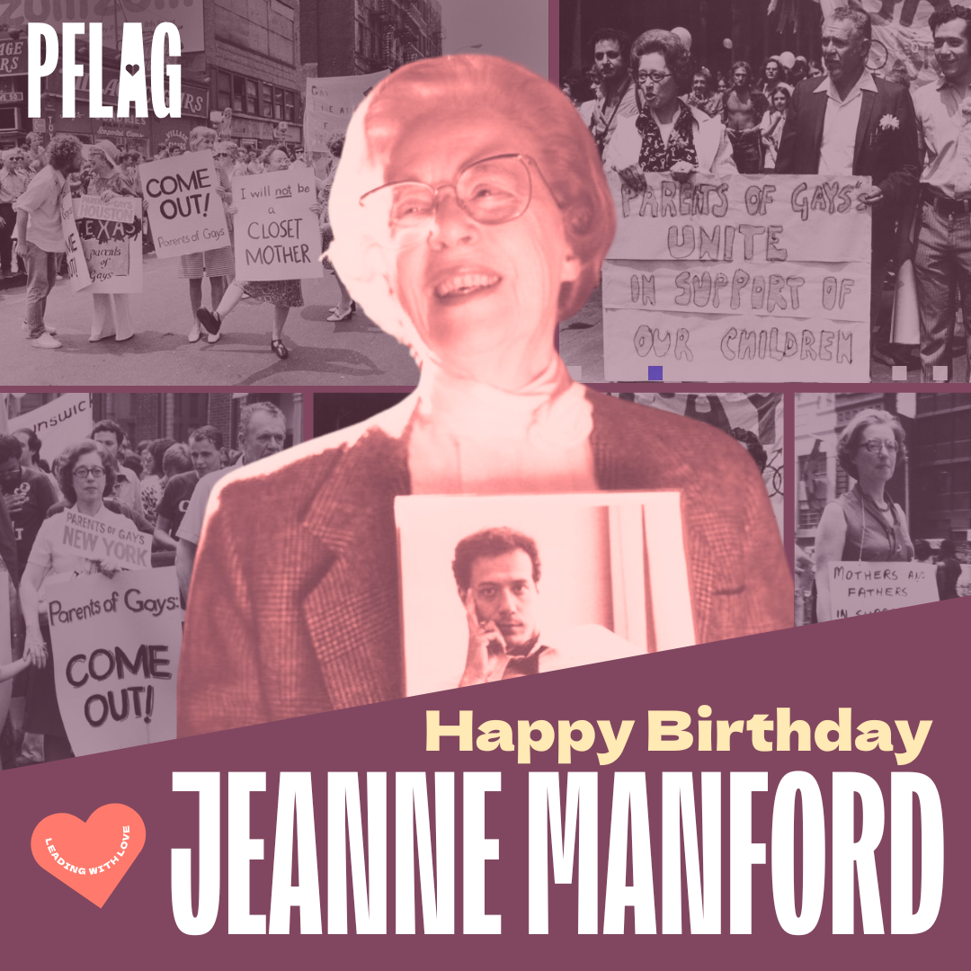 | A fierce mother, determined activist, and proud founder of PFLAG, Jeanne Manford was born on December 4th in 1920! Since marching with her son, Morty Manford, at the 1972 NYC Christopher Street Liberation Day March, Jeanne has inspired millions of parents, families, and allies to lead with love. For over 50 years, PFLAG National has provided support, offered education, and advocated for lasting policy change. We are proud to carry her incredible legacy, and fight for a loving, affirming, and equitable world for all LGBTQ+ people. Happy birthday, Jeanne! Learn more about PFLAG’s founding and history at pflag.org/our-history. |
