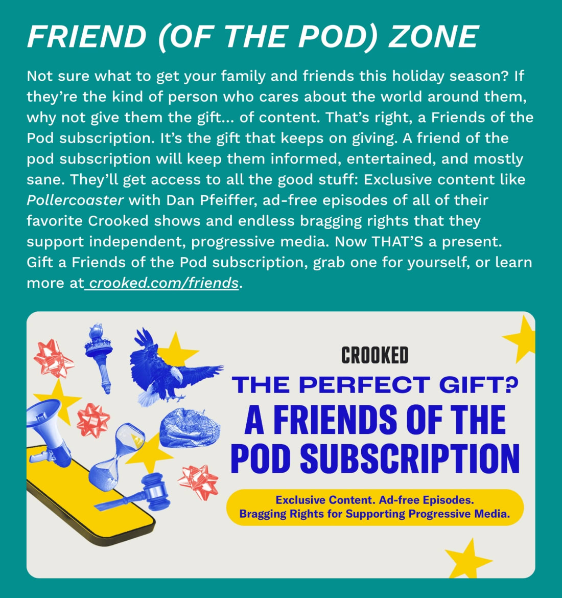 Another ironic twist: Trump promised to pardon former Honduran President Juan Orlando Hernandez, who was convicted of taking part in a scheme to bring more than 500 tons of cocaine into the U.S. over two decades. So, does he care about drug trafficking or not? WHAT ELSE?The Pentagon is rolling out the welcome mat for its new Looney Tunes-esque right-wing press corps this week, after kicking out every traditional outlet. From Monday to Wednesday, MAGA influencers including Laura Loomer and Tim Pool, are invited to mingle with officials, join an in-person briefing, and attend a meet-and-greet with Pete Hegseth. I mean, Supreme Warlord Pete Hegseth. My bad! Investigators are filling in the backstory behind Rahmanullah Lakanwal’s alleged shooting of two National Guard troops in Washington, D.C. last week. The recent death of his commander saddened Lakanwal, while he struggled with securing a job and feeding his five children, according to ABC News. Trump commuted the sentence of David Gentile, a private equity executive convicted of fraud in a scheme that cost thousands of victims $1.6 billion. Gentile had served less than two weeks of his seven-year sentence when the president stepped in. How much damage did this guy cause? As one victim told prosecutors: “I lost my whole life savings… I am living from check to check.” Not that Trump has any idea what that means! UnitedHealthcare shooting suspect Luigi Mangione appeared in court today, where his lawyers argued that two key pieces of evidence should be tossed: A 9 mm handgun, and a notebook in which Mangione allegedly wrote about his intent to “wack” an executive. Another weird fact: A correctional officer testified that the superintendent told him the prison “did not want an Epstein-style situation” with Mangione, referring to the late child sex predator’s suicide. Huh? Donald Trump pledged to release the results of his recent MRI test… which, he claimed, definitely didn’t scan his brain. “It was just an MRI,” Trump told reporters. “What part of the body? It wasn’t the brain because I took a cognitive test and I aced it.” I mean… okay. That test Trump likes to brag about involves identifying cartoon pictures of animals. Don’t take it from me: Greg, my editor, attempted the test back when he worked for VICE News days. It’s a great watch. Trump ally Rep. Troy Niehls (R-KY) said he plans to retire next year to focus on his family. Translation: Morale on Capitol Hill is so low among Republicans that some lawmakers are looking for a way out. “It’s no longer an exaggeration to say that House Republicans could lose their majority during this Congress,” Punchbowl News writes. “Whether Republicans agree or not, their majority is slipping away.” Sen. Cory Booker (D-DE) got married over the weekend to a woman he met on a blind date last year. Booker’s major life update is fueling speculation that he wants to run for president again; it’s incredibly rare for a commander-in-chief to be unmarried. Israeli Prime Minister Benjamin Netanyahu requested a pardon for himself amid longstanding corruption charges over the weekend — in a move that appears torn from Trump’s playbook. “If Mr. Netanyahu’s petition works, he escapes criminal liability,” the New York Times writes, paraphrasing an Israeli professor. “If it does not, and his trial proceeds, he has a new issue to run on in next year’s election: the supposed witch hunt against him.” “Rage bait” is the Oxford Dictionary’s word of the year. I’m fuming. LIGHT AT THE END OF THE EMAIL…An appeals court disqualified former Trump personal lawyer Alina Habba from serving as New Jersey’s top federal prosecutor. The decision likely marks the end of a drawn-out saga in which Trump’s team repeatedly attempted to keep Habba installed, even though her interim appointment expired and she hasn’t been confirmed by the Senate. A new type of glasses lens approved by the FDA would help preserve the eyesight of nearsighted children. The potential benefits could include staving off cataracts, glaucoma and even retinal detachment, according to experts. Disney’s “Zootopia 2” was a hit over Thanksgiving break, raking in $156 million in the U.S. and a record-breaking $400 million internationally. Scientists at a startup are experimenting with methane-eating microscopic pink organisms, which may be able to mitigate the effect of cow farts and burps on the warming climate. “From a climate perspective, zero percent of the methane is being captured currently, so any reduction at all is still a net benefit,” Josh Silverman, who founded the company, told the Washington Post. “The fact that we could achieve such a high conversion with a cheap, small-scale, farm-viable approach fills a niche that has been historically a very tough area to crack.” More than 400 people finished the inaugural Taco Bell 50k in Virginia and Washington, D.C. on Saturday. Participants, myself included, had to eat at nine Taco Bell locations across more than 32 miles. The best part was running through random parking lots with a bunch of strangers, some dressed in taco costumes, as normal people give you funny looks. Let’s get a What A Day crew to run it next year, what do ya say? You’re currently a free subscriber to Crooked Media. For the full experience, upgrade your subscription. |