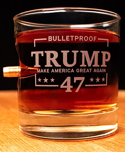 Show your support for President Trump with this special limited edition Bulletproof Trump 47 Whiskey Glass!