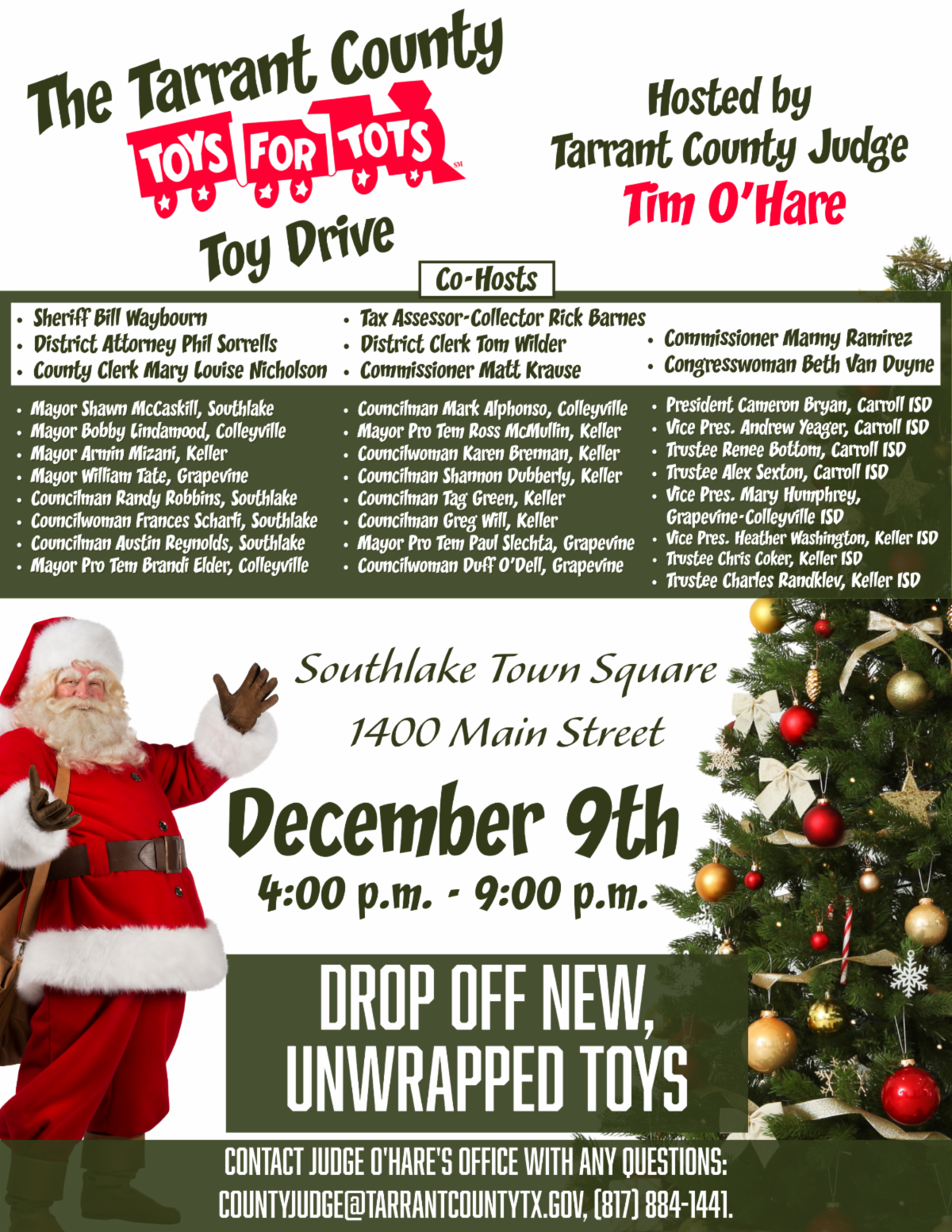 Please join us in making sure as many Tarrant County children as possible experience the joy of opening a Christmas present. On Tuesday, December 9th, over 30 Tarrant County elected officials and I are hosting a Toy Drive in Southlake. We want this to be the biggest toy drive Tarrant County has ever seen. Drop off your new, unwrapped toy (or multiple toys) any time that day between 4:00 p.m. - 9:00 p.m. at Southlake Town Square. |