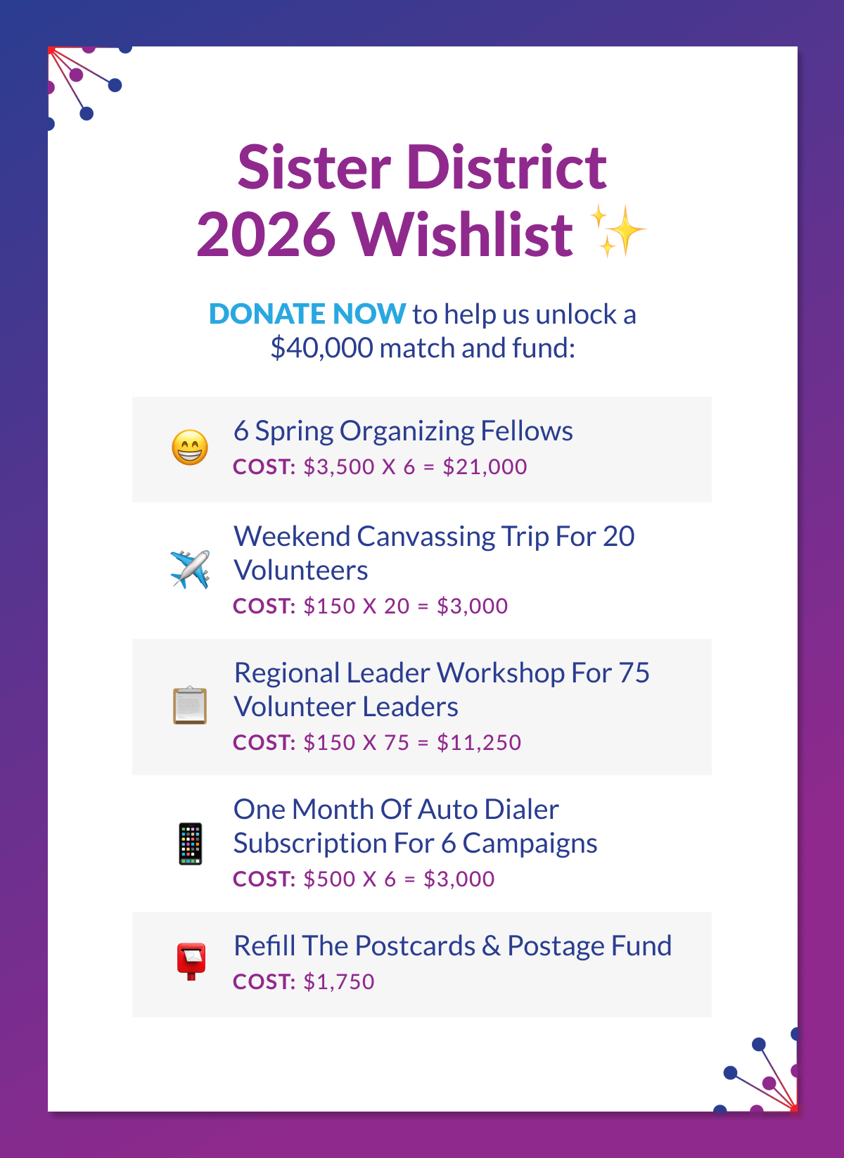 On behalf of the entire Sister District team, thank you for choosing to put your resources toward building enduring progressive state power.