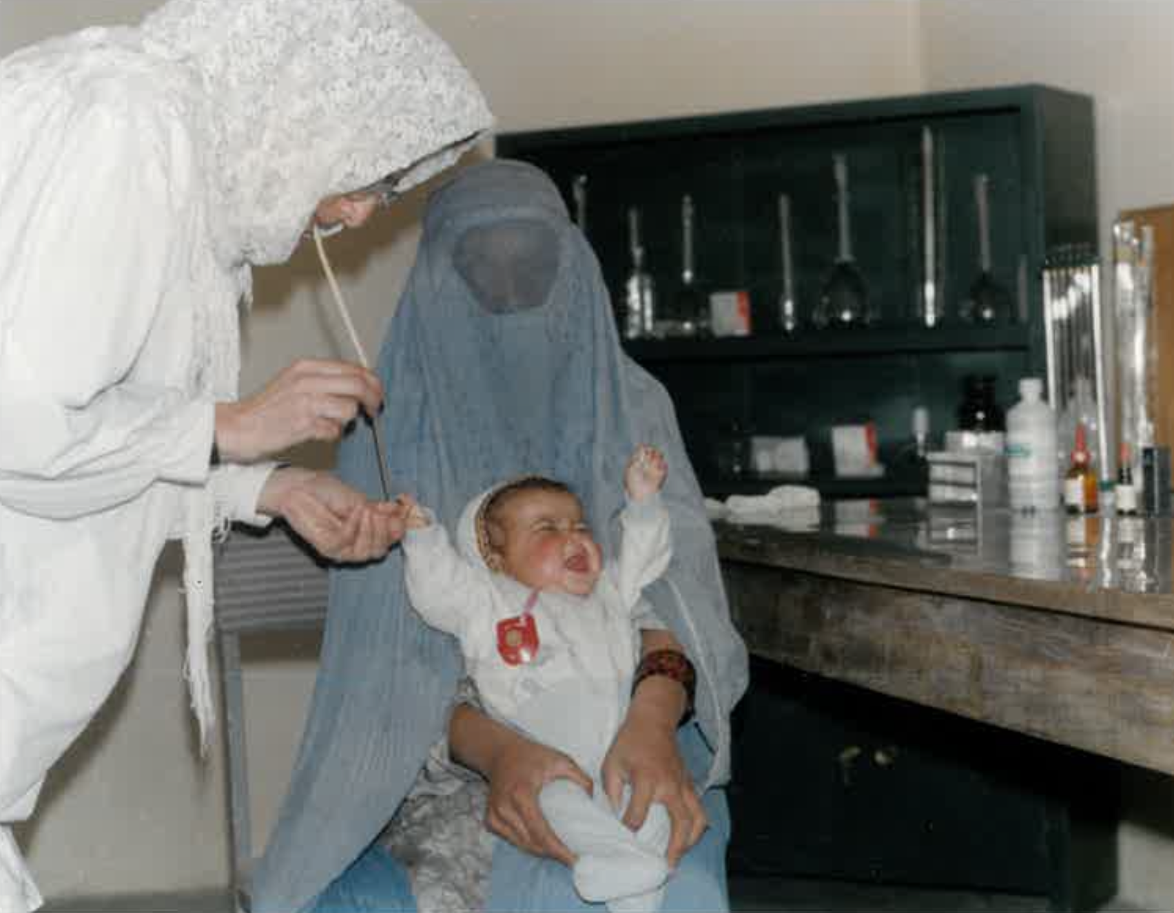 A woman wearing a Burka takes her baby to receive medical care. Kabul, 1998 (Feminist Majority Foundation) |