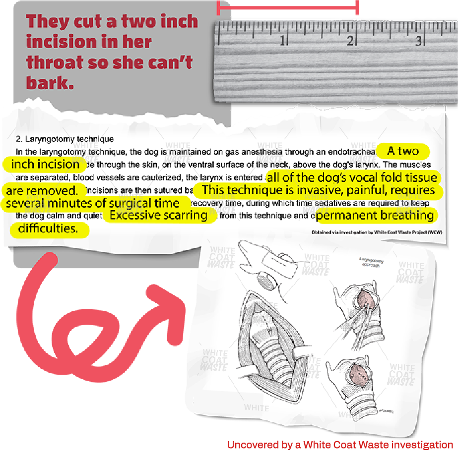 Sadists in white lab coats can’t be bothered to listen to heart-wrenching screams. So, they cut a two-inch incision in each puppy’s throat and slit her vocal cords.