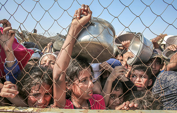 A Palestinian girl carries an empty pot as she waits for a hot meal at a community kitchen in Khan Younis. © Abed Rahman Baba