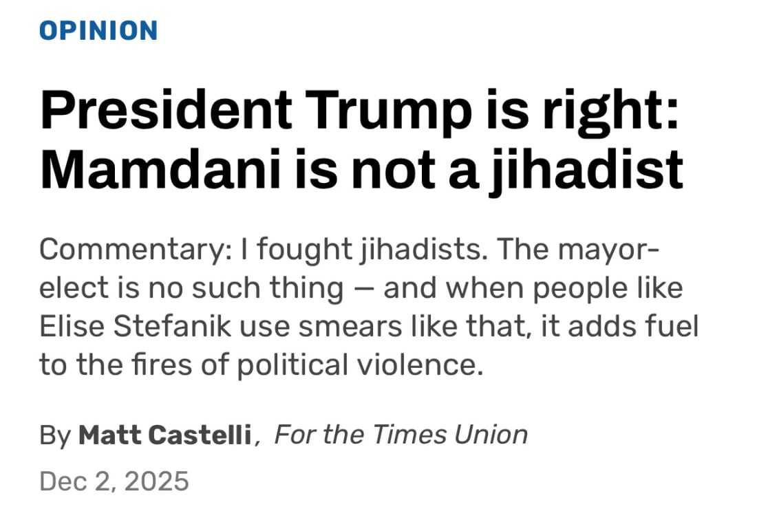 Yesterday, the Times Union published an op-ed I wrote about something deeply troubling happening in our politics — and in New York. Rep. Elise Stefanik continues to falsely claim that New York City Mayor-elect Zohran Mamdani is a “jihadist.” Even Donald Trump rejected Stefanik’s claim during a recent Oval Office meeting, praising Mamdani instead. But Stefanik doubled down anyway, making it the centerpiece of her run for governor. As someone who spent nearly 15 years at the CIA and the White House fighting real jihadists, I wrote this piece for one reason: Rhetoric like Stefanik’s has contributed to a surge in political violence across the country by portraying fellow Americans as as enemies and existential threats. This is what American terrorism looks like today. I don’t agree with every position Mamdani takes. But he is not a jihadist — and labeling him one puts people at risk. It is the kind of fear-based politics that has already helped fuel violence across this country.