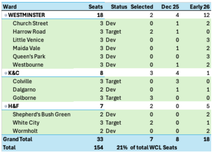 At our most recent meeting, the WCL Officers Team voted unanimously to designate several West Central London wards as development wards for the May 2026 elections. This is an exciting step that will help us focus resources where we can make the biggest impact.