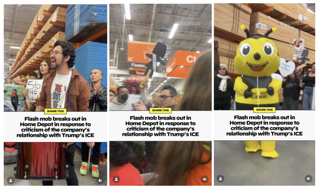 COURIER covers nationwide boycotts and death threats in New HampshireEpstein travels, MAGA masculinity, and moreHi all! COURIER’s upcoming event, Courage > Cowardice, is almost here — and tickets are limited! On December 11th, we’re bringing together organizers, journalists, creators, and movement leaders who are rebuilding power and pushing back against extremism every day. Speakers include Yasmin Radjy, Meredith Lynch, Andrea Chalupa, Jack Cocchiarella, Brian Beutler, Rashad Robinson, Nourbese Flint, and Melissa Morales. From movement building to media courage, these conversations will go deep into what it takes to meet this moment — and what comes next. With food, drinks, and an open-bar reception included, this is one of our most energizing events of the year. Few spots remain — claim yours before they’re gone and be part of a powerful night of resistance, reflection, and community. I hope you’ll join me there! - Charlotte Robertson P.S. If you haven't already, give us a follow on social (like and subscribe to our YouTube, Instagram, TikTok, Bluesky, Threads, and X/Twitter) to make sure you don't miss anything. The French connection: Monsieur Epstein’s Parisian nodeEpstein is said to have trafficked “more than a thousand” humans as a brothelkeeper to the elites. Nina Burleigh delves into public domain records to further dissect his disturbing European travels in American Freakshow. The males of MAGA manspread their insecurityMark Jacob takes a look into the fragile male egos behind the MAGA movement, examining key right-wingers like Pete Hegseth, RFK Jr., Jesse Watters, and more in this week’s Stop The Presses. Chief Justice John Roberts walks into Nuremberg, the film…In this week’s scorching edition of Grave Injustice, Lisa Graves holds Supreme Court Justice John Roberts’ feet to the fire and dissects how his decisions are moving the law further away from justice. Make your MAGA uncle madLooking for ways to make your MAGA uncle mad this season? COURIER’s got you covered. COURIER’s new merch store is filled with tees, totes, and mugs that are perfect to give for a cheeky gift or to wear if you want to make a statement at the holiday table. Shop for merch here. COURIER has doubled its social media following across state and national accounts from 4 million to 8.5 million since Trump was reelected. This growth was recently highlighted by The Washington Post. On COURIER's TikTok, you can see the top post of the week here with 8.9+ million views and 825,000+ likes. On COURIER's Instagram, you can see the top post of the week here with 2.1+ million views and 156,000+ likes. Holiday carolers protest Home Depot’s relationship with Trump’s ICEHoliday carolers sang outside of Home Depot to support the We Ain’t Buying It boycott. The boycott targeted Home Depot, Target, and Amazon for enabling the Trump administration. COURIER has the viral video. Indiana Republican says he’s a ‘No’ on redistricting after Trump uses slurIndiana Senate Republican Mike Bohacek, whose daughter has Down Syndrome, announced he will vote ‘No’ on Trump’s redistricting efforts, citing Trump’s offensive slur as the reason why. COURIER has the story. Flash mob protesting ICE breaks out in Home DepotProtesters beat on drums, dressed up, and more to protest ICE. The flash mob came ahead of the nationwide ‘We Ain’t Buying It’ boycott of Home Depot, Target, and Amazon. COURIER has the video. Support independent mediaIf you support news without all the bullsh*t, consider making a contribution to COURIER this holiday season. Together, we can build a more informed, engaged, and representative America. Goodlander gets bomb, death threats amid NH GOP smear campaignCOURIER’s New Hampshire outfit, Granite Post, reported on bomb and death threats Congresswoman Maggie Goodlander’s office fielded after Trump called her and fellow lawmakers “traitors.” Medical students are questioning their future in TexasCOURIER Texas spoke with an OB-GYN in training who wants to provide the highest standard of care for women — but she fears that state laws won’t let her. |