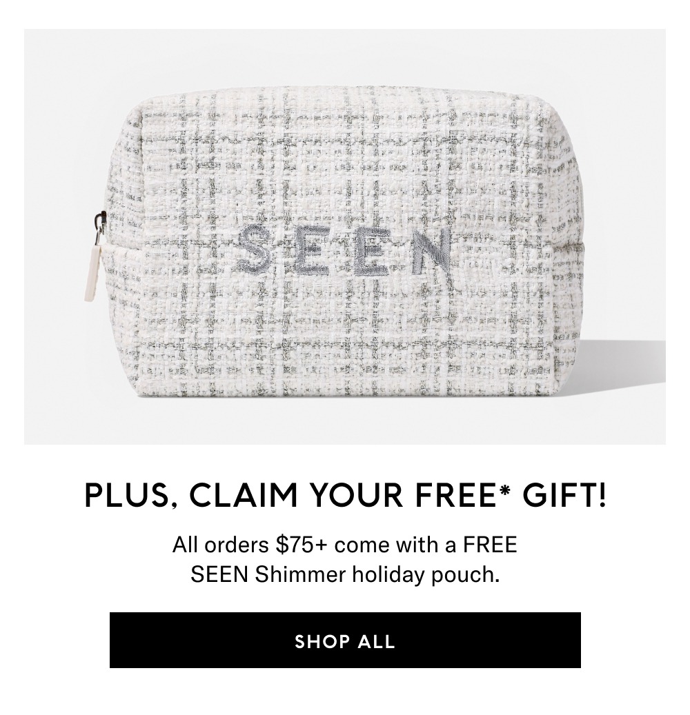 Terms & Conditions: Free SEEN Shimmer Holiday Pouch automatically added to all orders $75+ on
