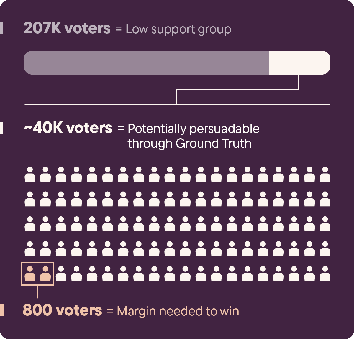 Even if only 1 in 5 voters in this group were reachable (~40k voters), identifying and turning out just 2% of those reachable voters could’ve changed the outcome of the race.