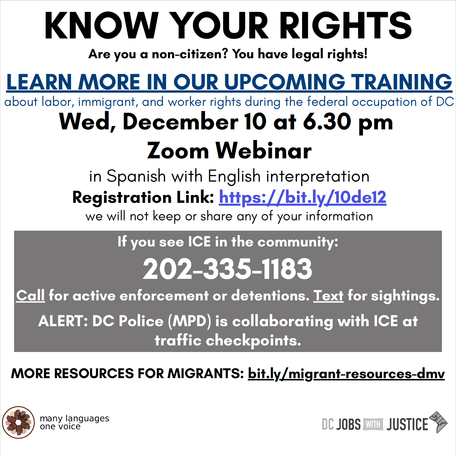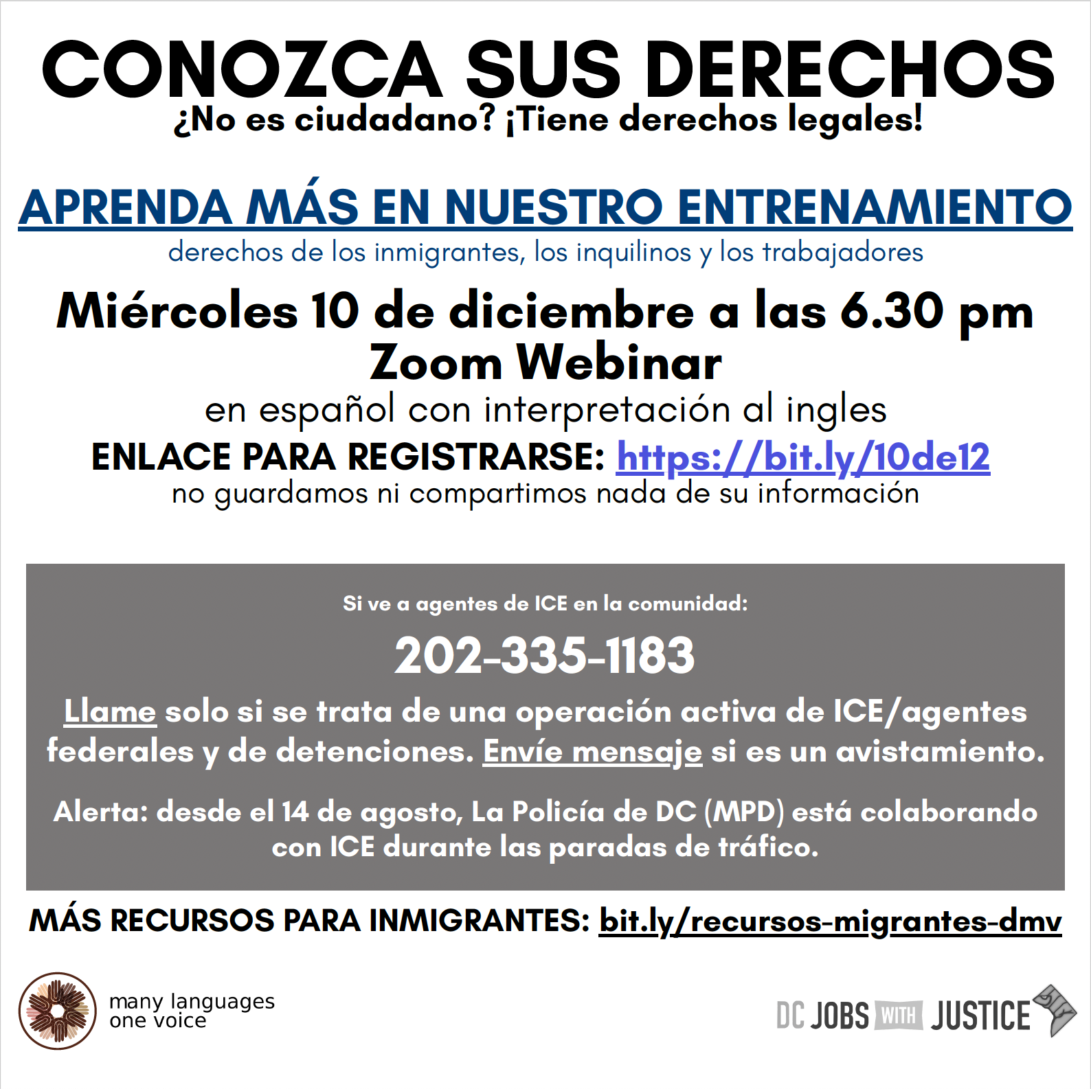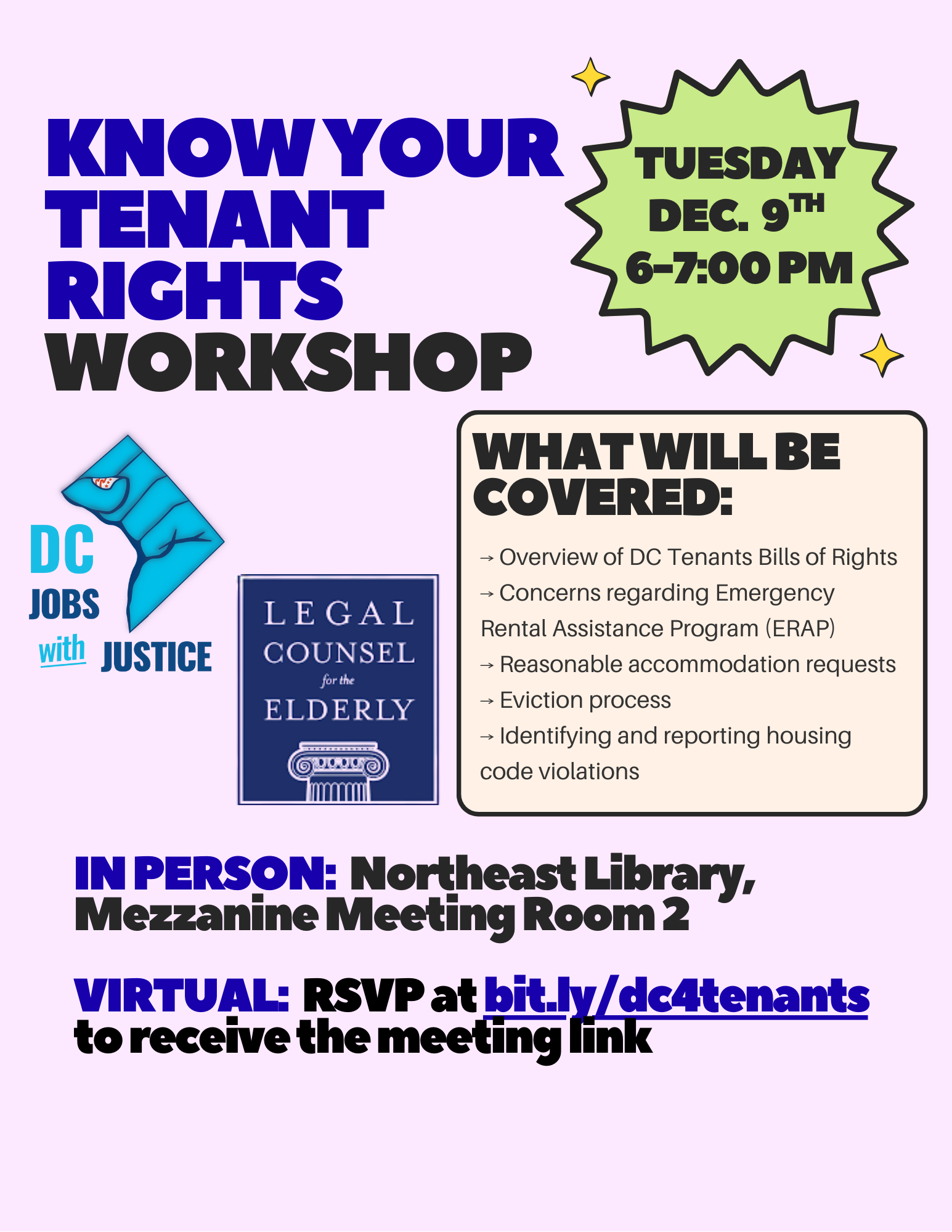DC Jobs With Justice y Legal Counsel for the Elderly organizan conjuntamente un taller sobre los derechos de los inquilinos el próximo martes 9 de diciembre a las 6:00 p. m. Los asistentes pueden participar en persona en la Northeast Neighborhood Library o de forma virtual confirmando su asistencia aquí.