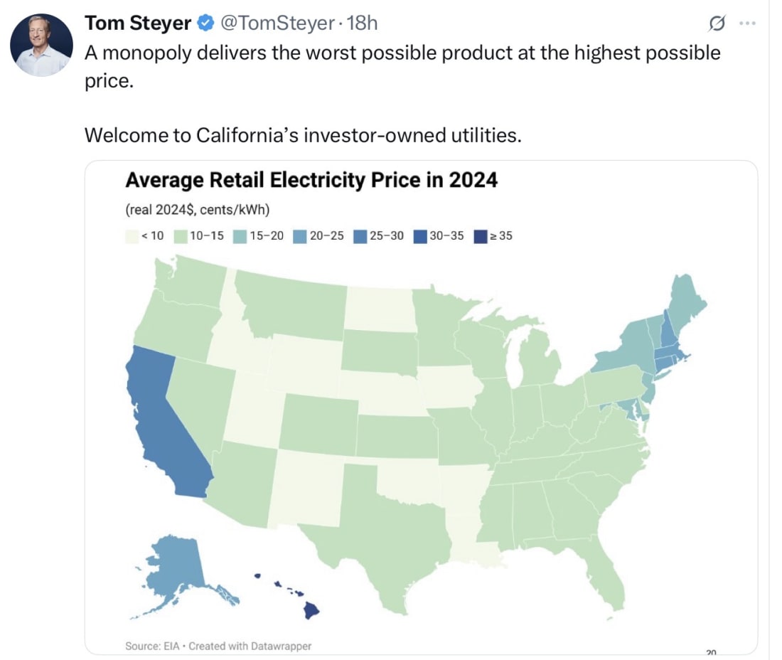 This content is available for free to all subscribers. But you really should consider a paid subscription. This unlocks our afternoon e-mails, our Saturday “What is Jon Reading” e-mail, and analysis on breaking news. Normally a subscription is a modest $7 a month or just $70 for the year. Steyer Watch: Billionaire Wanna-Be Governor Opens His Campaign With A False Story About Your Energy BillA familiar Steyer playbook emerges: blame the marketplace, ignore the mandates, and spend lavishly to sell the story.(Typically our afternoon content is for our paid subscribers, but Steyer Watch is a public service to all - so no paywall on this content.) Tom Steyer’s New Campaign Runs on Old HypocrisyBillionaire activist Tom Steyer is back — this time running for governor of California — and he has wasted no time launching his campaign with a claim that is already misleading. His opening message to voters is that California’s crushing energy costs are the fault of monopolistic private utilities — a storyline he is using to cast himself as a champion of affordability. We will get to that claim in detail below. But first, it’s worth pausing on the irony at the center of Steyer’s public persona: after making his fortune investing in and promoting fossil-fuel industries, he has reinvented himself as a frontline environmental crusader, joining the modern jihad against carbon emissions. Now he is blaming California’s energy costs on everything except the policies he spent years promoting. From Oil Profits to Climate CrusaderFor years, Steyer built enormous wealth through hedge-fund investments that included oil, coal, and other carbon-intensive industries. That fortune later financed his political reinvention as a climate activist. As I detailed previously in a Thanksgiving Day New York Post column examining his record, Steyer made billions from fossil fuels before deciding to use that money to attack the industry that funded his rise. It was a remarkable political makeover — one that won him applause on the left only by quietly setting aside how his fortune was made. When Steyer took this activism to the national stage in his failed run for president, he spent hundreds of millions of his own dollars and disappeared from the race almost as quickly as he entered it. The lesson was unmistakable: unlimited personal spending could not manufacture public trust. Now he is trying again, this time in California, and the money is flowing even faster. He dropped roughly $12 million into the Yes on Proposition 50 campaign, underwriting an ad blitz that elevated his own profile as much as the ballot measure itself. Days later, reports surfaced that he had written a $20 million check to launch his gubernatorial campaign, with little doubt that more was to come. Money is not his obstacle. Credibility is. Trying to Purchase an Affordability MessageSteyer has suddenly repositioned himself as a crusader for affordability in a state already buckling under the cost of housing, fuel, electricity, and everyday necessities. His newest move is an attempt to persuade Californians that their sky-high power bills are the product of “monopolistic” investor-owned utilities. He has leaned heavily into the idea that utility monopolies are the central reason electricity is so expensive here, promising to “break up monopolistic power” and deliver dramatic rate reductions. That argument does not survive even a cursory look at the numbers. California’s three major investor-owned utilities now post the highest residential electricity prices in the continental United States. Pacific Gas & Electric’s bundled non-CARE residential customers have been paying average rates in the low-to-mid-40-cent-per-kilowatt-hour range in recent months. Southern California Edison reports average residential rates just above 30 cents per kilowatt-hour, climbing into the mid-30s with recent increases. San Diego Gas & Electric’s residential rates have hovered in the high-30-cent range and have pushed up toward 40 cents per kilowatt-hour — among the most expensive of any large utility in the country. How Other Investor-Owned Utility States CompareNow compare that to other states that also rely on investor-owned utilities. Florida Power & Light customers typically pay around 15 cents per kilowatt-hour — less than half of California’s average. Texas, served by large investor-owned utilities such as Oncor in a competitive market, also averages in the mid-teens, roughly 15 cents per kilowatt-hour. Even New York, often cited as a high-cost energy state, averages in the mid-20s per kilowatt-hour — still far below California’s statewide average, which now sits a little above 32 cents. All of these states rely on investor-owned utilities. The business structure Steyer attacks exists nationwide. The price explosion does not. Something else is at work. The Real Drivers of California’s Energy CostsHere is the inconvenient truth Steyer prefers not to discuss: California’s electricity prices are primarily driven by layers of taxes, fees, mandates, and regulatory experiments born of the state’s aggressive climate agenda. Utilities are required to meet some of the world’s most stringent renewable-energy mandates. They must purchase power from favored “clean” sources regardless of relative cost. They must absorb billions in grid-hardening projects ordered by regulators. They must comply with carbon-trading rules, cap-and-trade fees, renewable portfolio standards, battery-storage requirements, transmission upgrades, and regional emissions-reduction targets — all of them. At the same time, the state presses toward a 100-percent clean-energy mandate by 2045. Every mandate carries a cost. Every cost ends up on the monthly bill. In Texas, electricity pricing reflects competition, energy abundance, and a more restrained regulatory regime. In Florida, energy policy prioritizes reliability and affordability while upholding envi