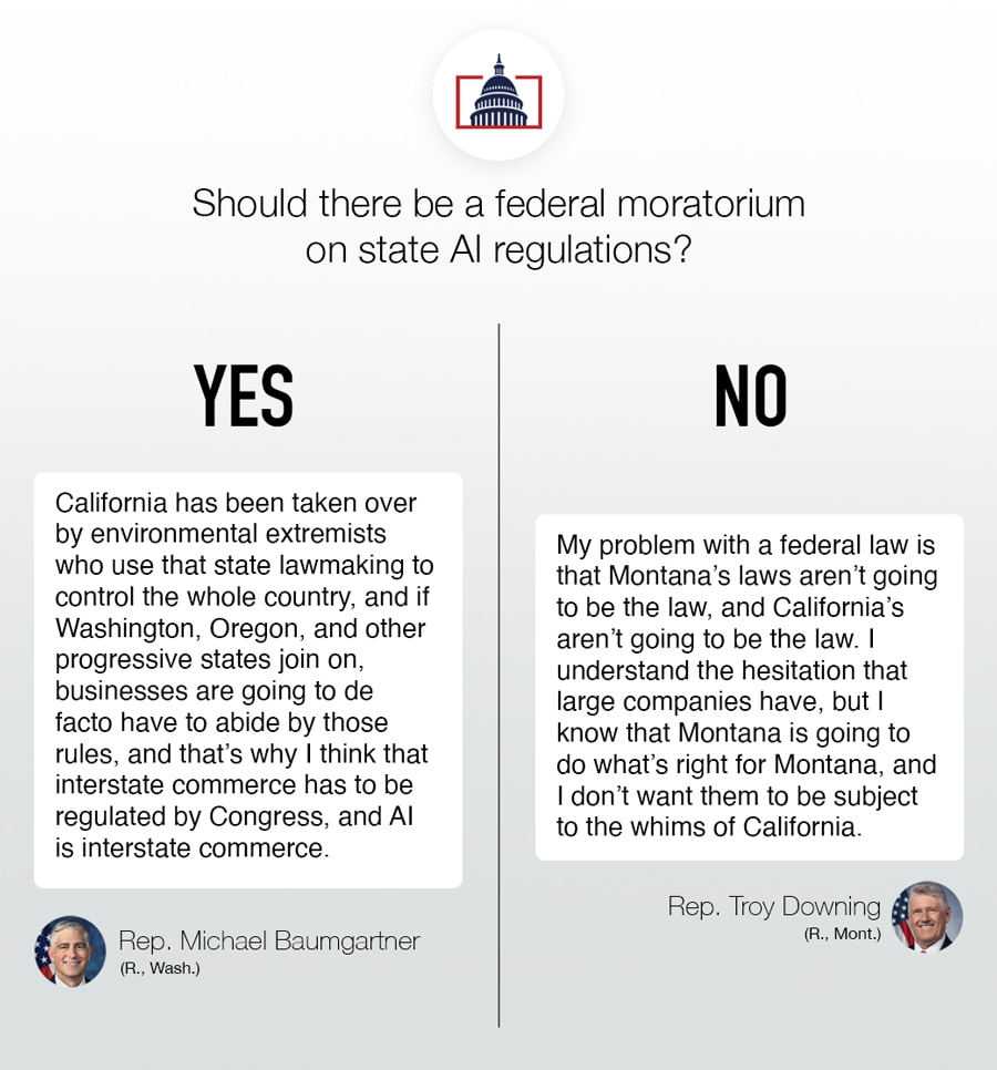 INTERVIEW: Thirteen House Republicans debate a federal moratorium on AI and discuss lessons from the Schumer Shutdownby Matthew Foldi Do Republican lawmakers want guardrails on artificial intelligence (AI) regulation? Do they want to defer to the 50 laboratories of innovation? Are they concerned about turning regulation over to California or the European Union? The answer is yes — depending on who you ask. The Washington Reporter interviewed 13 House Republicans about their thoughts on a potential federal moratorium on states regulating AI, and received a series of wide-ranging responses, ranging from staunch support for the moratorium to opposition. While most House Republicans that we spoke with were supportive of a moratorium on state-based AI regulations, at least three of the 13 we spoke with either opposed or expressed concerns about a federal moratorium. Rep. Michael Baumgartner (R., Wash.) cautioned that “we need to make sure that we don’t outsource AI regulation to California or to Brussels. If we allow each state to do it, because California is the largest market, Gavin Newsom and the radical leftists in California will have a significant impact on what happens with artificial intelligence, and this is a race against China.” Heard on the Hill
