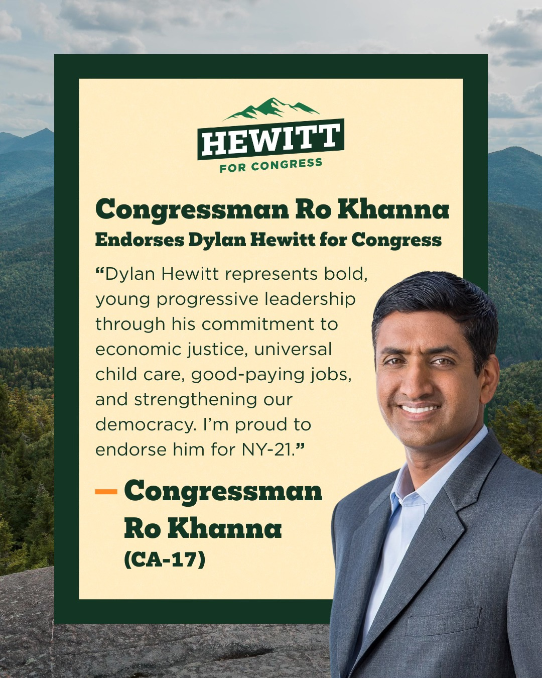 "Dylan Hewitt represents bold, young progressive leadership through his commitment to economic justice, universal childcare, good-paying jobs, and strengthening our democracy. I'm proud to endorse him for NY-21."