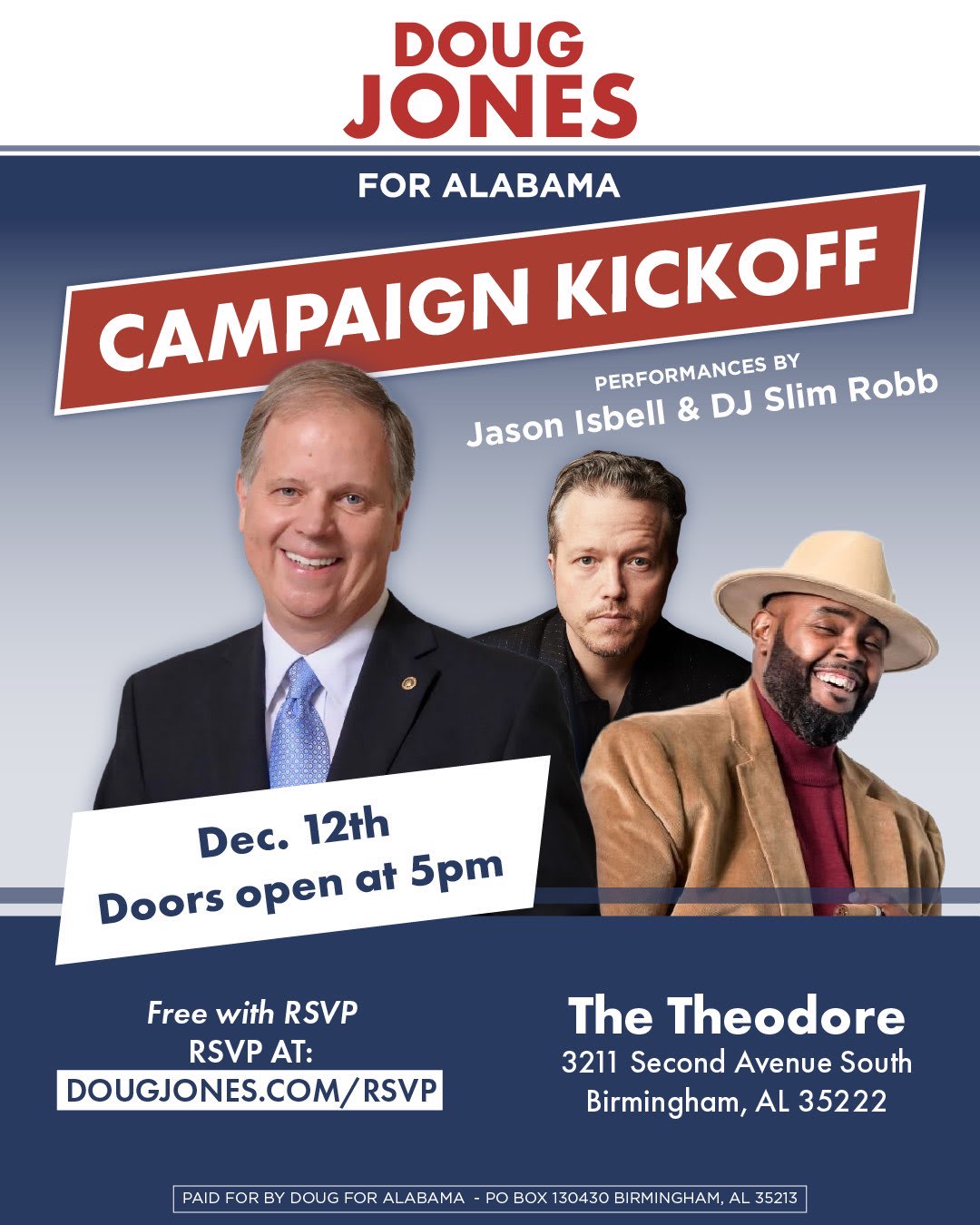 Folks, we told you to stay tuned, and now we’re ready to make a big announcement. I know you remember election night on December 12, 2017. That night eight years ago, we made history together. And so, eight years to the day after our historic Senate victory, I’m officially launching my campaign for governor of Alabama on December 12 at 5 PM in Birmingham. The energy we’ve seen already is electric, and you definitely won’t want to miss out on being a part of my campaign launch event. My friends Jason Isbell and DJ Slim Robb will be there. Will you? If you’re able to come, get in your RSVP now >> If you won’t be in Alabama on the 12th, please forward this message to somebody who can make it. I can’t wait to see you there. -Doug Paid for by Doug for Alabama - PO Box 130430 Birmingham, AL 35213 |