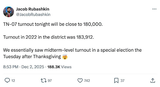 Turnout was actually very high in the TN-07 special election — at Midterm participation levels. Both Republican and Democratic voters showed up, and the GOP still only won by 9 points in a district that Trump won by 22% last year: