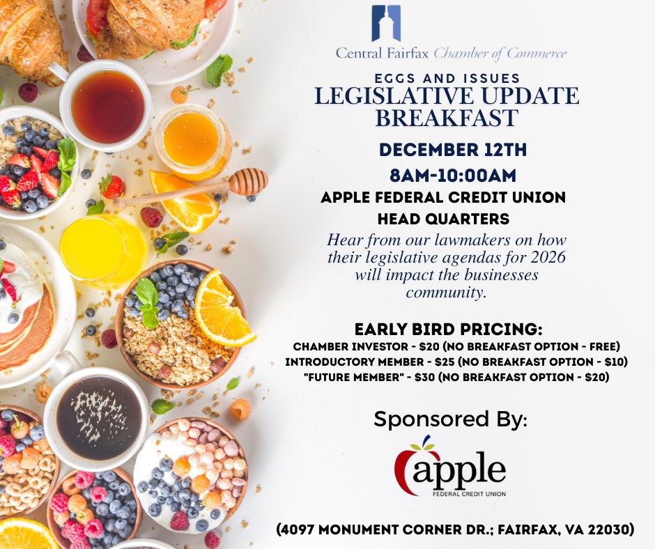 Central Fairfax Chamber of Commerce Eggs and Issues Friday, December 12, 8-10am 4097 Monument Corner Dr, Fairfax Senator Salim will be a participant in the panel discussion. Learn more and register here. |