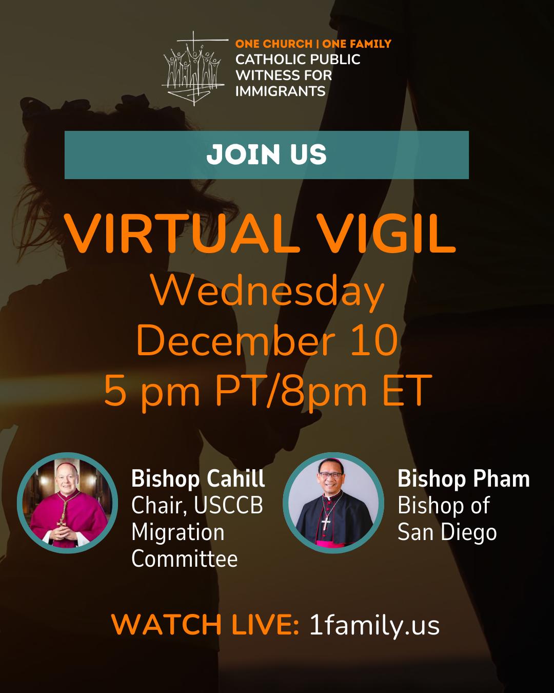 On December 10th at 5pm PT/8pm ET, Bishop Cahill, the new chair of the USCCB Migration Committee and bishop of the Diocese of Victoria, TX will host a vigil with One Church One Family in solidarity with migrants. Bishop Pham of the Diocese of San Diego will also participate. The vigil will be held primarily in Spanish on Youtube with interpretation into English via zoom. Register for the virtual vigil here. It will also be livestreamed at 1family.us