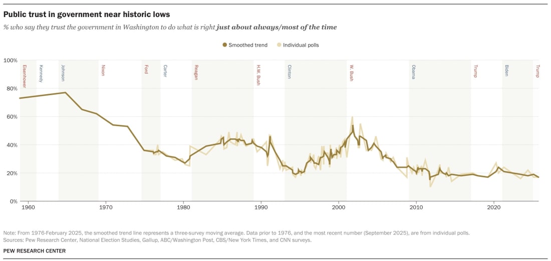 Thank you for being a free subscriber to So, Does It Matter? Please support what we do. And also get 100% of our content (right now you get about 60% of it!). *Breaking* New Nationwide Survey Shows Why So Many Americans Do Not Trust Government, And A Cautionary Note For The RightNew Pew Research data from 1958–2025 shows public trust collapsing during periods of sweeping federal power and ideological governance.Public Trust In Government Is Nearing It’s Historic Low PointIn 1964, nearly 77 percent of Americans said they trusted the federal government to do what is right most of the time; today, that figure stands at just about 22 percent. Americans once trusted their government — deeply. In the early 1960s, nearly eight in ten said they believed Washington would usually do the right thing. That level of confidence now feels almost unimaginable. Pew Research’s newly released long-range dataset delivers a blunt verdict: public trust in the federal government sits today near the bottom of a seventy-year chart. And while distrust has risen gradually over decades, it has also fallen in sudden, sharp drops at key political moments. Confidence doesn’t fade quietly. It collapses when power accelerates and large parts of the country feel left behind. 🔒 This analysis continues below for paid subscribers.The Pew data reveals a recurring governing pattern — from Obama to Trump — and raises a hard question for the right about how power is used, not just won. Upgrading to a paid subscription unlocks about 40 percent of all content here at So, Does It Matter?, and directly supports my independent work calling balls and strikes on California politics. Inside the paid section: