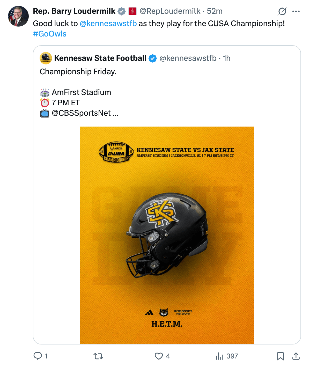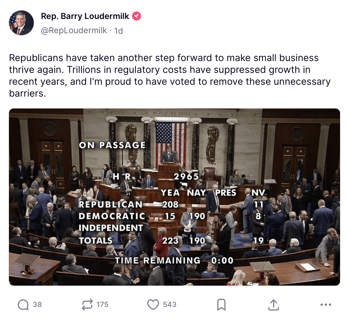 Friends, I hope you are doing well. As your Representative in Congress, it’s a priority to keep you informed of how we're serving you. If you would like to stay up to date, check out our website, and follow our Facebook, Twitter, and Instagram pages. Looking forward to seeing you in Georgia's 11th Congressional District or in Washington, D.C. soon. | Rep. Barry Loudermilk U.S. Congressman, Georgia's Eleventh District | Votes This Week: Republicans Vote to Strengthen Parental Rights, Remove Foreign Influence from Schools, and Loosen Regulations on Small Business | H.R. 1005 – Combating the Lies of Authoritarians in School Systems Act (Sponsored by Rep. Joyce (OH) / Education and Workforce Committee) H.R. 1069 – PROTECT Our Kids Act (Sponsored by Rep. Hern / Education and Workforce Committee) H.R. 1049 – Transparency in Reporting of Adversarial Contributions to Education Act (Sponsored by Rep. Bean / Education and Workforce Committee) H.R. 2965 – Small Business Regulatory Reduction Act of 2025 (Sponsored by Rep. Van Duyne / Small Business Committee) H.R. 4305 – DUMP Red Tape Act (Sponsored by Rep. Wied / Small Business Committee) | Rep. Loudermilk Has Co-Sponsored the Following Legislation and Co-signed Official Letters | H.R. 6372 – D.C. Shield Law Repeal Act - This bill would repeal Titles I and II of the D.C. Council’s Human Rights Sanctuary Amendment Act of 2022, which provides legal cover for medical providers who prescribe abortion drugs or cross-gender hormones across state lines, which is prohibited. - Liberal states have drafted “shield laws” for abortion providers who perform abortions or prescribe abortion medication and cross gender hormone drugs to individuals in states where these actions are now prohibited. Each law varies slightly, but they all ultimately seek to allow the shield state to refuse to comply with another state's investigation or penalization of a provider. Washington D.C. is one of these areas. Letter to the Federal banking agencies (Fed, OCC, and FDIC) regarding enhanced prudential standards - Asks the agencies to review their application of enhanced prudential standards (EPS) to banks designated as Category II, III, and IV banking organizations and consider whether the current Category II, III, and IV EPS frameworks are proportionate to the risks presented by banks within these categories, whether reform of the EPS applicable to banks in these categories is warranted, and to index these regulatory thresholds Letter to the Federal banking agencies (Fed, OCC, and FDIC) to urge recission of four agency guidance documents - Asks the agencies rescind four agency guidance documents, including the leveraged lending guidance, model risk management guidance, third-party risk management guidance, and Venture Funding bulletin – each jointly issued by the Fed, OCC, and FDIC. - Rescinding these documents would align with President Trump’s Executive Order 14219 – Directing the Repeal of Unlawful Regulations as the four documents are improperly issued under the Congressional Review Act and reflect poor policy by materially hindering U.S. economic growth and our national security | Atlanta VA to Host Veteran Town Hall | U.S. Air Force Academy Summer Seminar Applications Now Open | The Summer Seminar 2026 application is open from 1 Dec 2025 to 15 Jan 2026. Current high school juniors are invited to apply. The Summer Seminar application can be accessed through the USAFA Admissions website, www.academyadmissions.com, and signing in to their portal account. USAFA is offering the following three sessions: - Session A: June 2-6, 2026 (In Person) - Session B: June 8-12, 2026 (In Person) - Session C: June 15-19, 2026 (In Person) | Jobs & Career Resources Available in Georgia | Washington DC Office 2133 Rayburn House Office Building Washington, DC 20515 Phone: (202) 225-2931 | Woodstock Office 9898 Highway 92 Suite 100 Woodstock, GA 30188 Phone: (770) 429-1776 | Cartersville Office 135 West Cherokee Avenue Suite 122 Cartersville, GA 30120 Phone: (770) 429-1776 | |