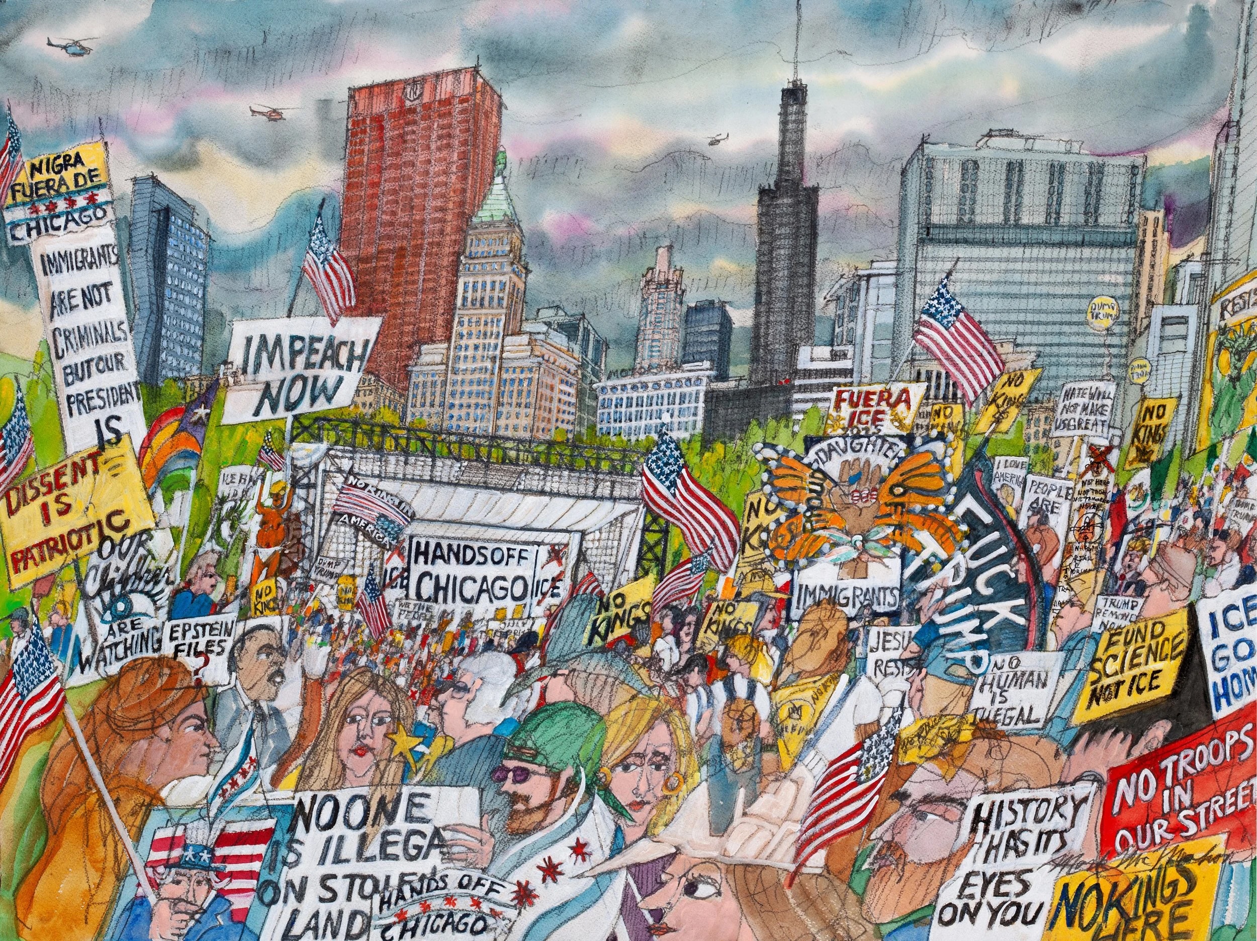 Carrying on this powerful legacy, Mark created the "No Kings" painting live, witnessing the action and energy of our movement in Chicago. While born from a specific moment, the piece represents the story of the entire No Kings movement. It is about being witness to history. It is about being a part of history.