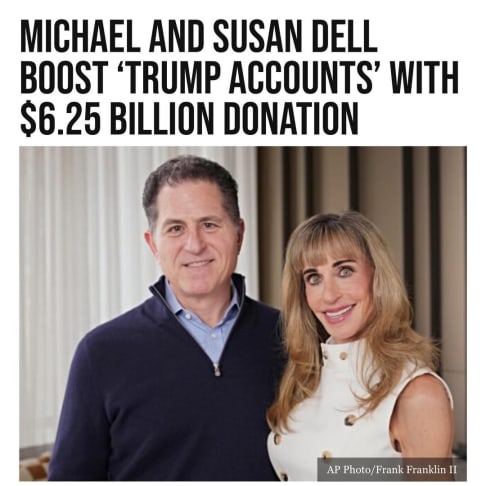 Also, let’s be honest about the drug issue. Shipping cocaine across borders is not the same as trafficking fentanyl, a synthetic opioid so potent that a few milligrams can kill. Fentanyl is massacring Americans. You can party on cocaine your entire life and never OD — but one line cut with fentanyl can put you in the ground. Fentanyl is not a “drug problem.” It’s chemical warfare on the American public. So yes — the country needs transparency on what was being intercepted and why. But we also need to stop pretending all “drug trafficking” is equal. It isn’t. Congress should have stepped in long before this became a viral video moment. 3. Michael and Susan Dell’s $6.25 Billion PledgeThis one blew up online for all the wrong reasons. The reaction to Michael and Susan Dell’s contribution to the children’s savings accounts created under the Big Beautiful Bill has been completely unhinged. The program itself creates accounts for children born between 2025 and 2028 and deposits one thousand dollars at birth. Private individuals and employers can contribute more. Here’s what’s actually happening:
