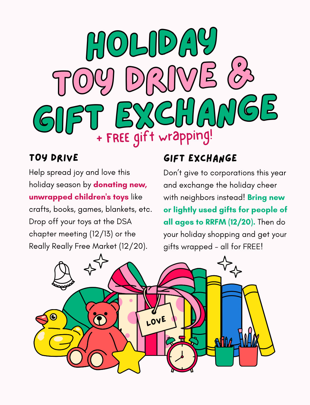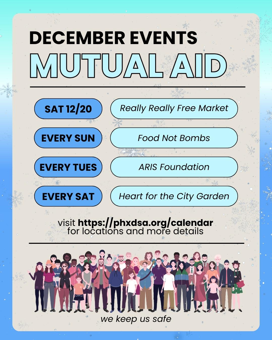 We'd especially like to encourage folks to lend a hand with Mutual Aid Committee this season, as they are running a toy drive and gift exchange at Really Really Free Market, among the many things they do year round! Read on to hear about everything the chapter is getting up to over the next couple of weeks!