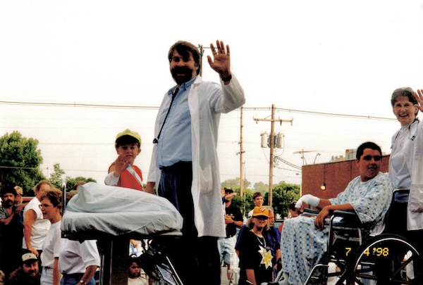 Me and my dad on the local hospital float in the 1998 Muscatine, Iowa 4th of July parade.