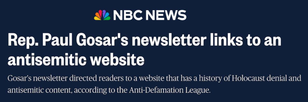 Gosar even linked to white supremacist websites and fringe content in his official House newsletters, once linking to a site that called two Biden Administration officials “Jewish Warmongers”: