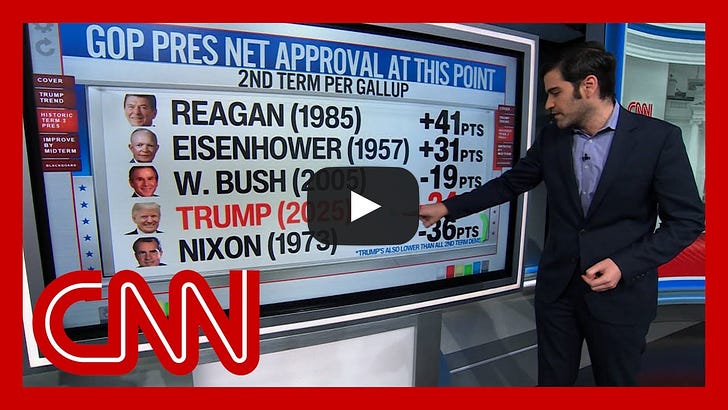 By Brian DaitzmanCNN Chief Data Analyst Harry Enten said President Donald Trump is in the worst second-term position in Gallup’s modern record at this stage except for Richard Nixon, calling Trump’s -24 net approval “a disaster if it holds.” President Donald Trump is entering the run-up to the 2026 midterm elections with a Gallup net approval of negative 24, a level that CNN’s chief data analyst, Harry Enten, said is worse than every modern second-term president at this stage except Richard Nixon. On CNN News Central, Enten called the position “a disaster if it holds” toward the midterms. Enten said Trump is “this far underwater” about a year before the midterms and argued that numbers at this level have historically been dangerous for a president’s party. He presented his warning as a product of Gallup’s long-running approval archive and its record of second-term comparisons. The warning matters nationally because midterm elections often reorder congressional power and can shift the direction of federal policy. Enten anchored his argument in Gallup’s newest job-approval release, which showed Trump at 36 percent approval and 60 percent disapproval — his lowest approval rating of the second term, as presented on CNN. On air, Enten emphasized the pace of the decline. He noted that Trump’s net approval in January was about negative one point, close to even, and that it now stands at -24, a swing of roughly 23 points in less than a year. Enten said the drop matches a broader polling pattern. He told viewers he had counted roughly ten national polls from different survey firms in the last 40 days showing Trump at his second-term low. To put Trump’s position in context, Enten turned to Gallup’s historical record. He said the only modern second-term president who was worse off at a comparable stage was Nixon, whose net approval was around -36 points before he resigned in 1974. Enten also compared Trump with other recent two-term presidents. He said George W. Bush’s net approval at a similar point in 2005 was roughly -19 and noted that Republicans later suffered major losses in the 2006 midterms. He contrasted Trump’s standing with presidents who approached midterms from strength, citing Dwight D. Eisenhower at about +31 and Ronald Reagan at about +41 at comparable moments in their second terms. Enten added that Trump’s net approval at this stage is lower than the second-term readings for presidents including Harry Truman, Lyndon B. Johnson, Barack Obama and Bill Clinton. In Enten’s accounting, that makes Trump the second-weakest second-term president in Gallup’s record at this point before midterms. The core of Enten’s forecast rested on what he said about late turnarounds. Reviewing post-war trends, he said that since Truman, no second-term president in Gallup’s archive has improved his net approval by more than five points between this stage and midterm Election Day. Enten said Trump would need to “break history” to reverse course by 2026. Brian Daitzman is the Editor of The Intellectualist. Read the original article here. References