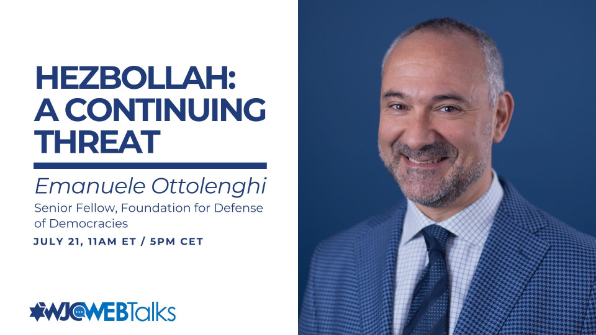 Tune in to our next WJC WebTalk on Tuesday, July 21, at 11:00am ET/5:00pm CET, with special guest Foundation for Defense of Democracies (FDD) Senior Fellow Dr. Emanuele Ottolenghi for a conversation on the continued threat posed by Hezbollah around the world.