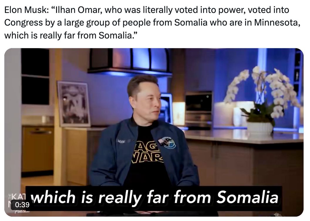 The constant targeting and harassment of Somali-Americans goes to show that Republicans like Elon and Trump really hate democracy. They want to be able to pick and choose who gets the right to participate in our government based on race, wealth, and religion.