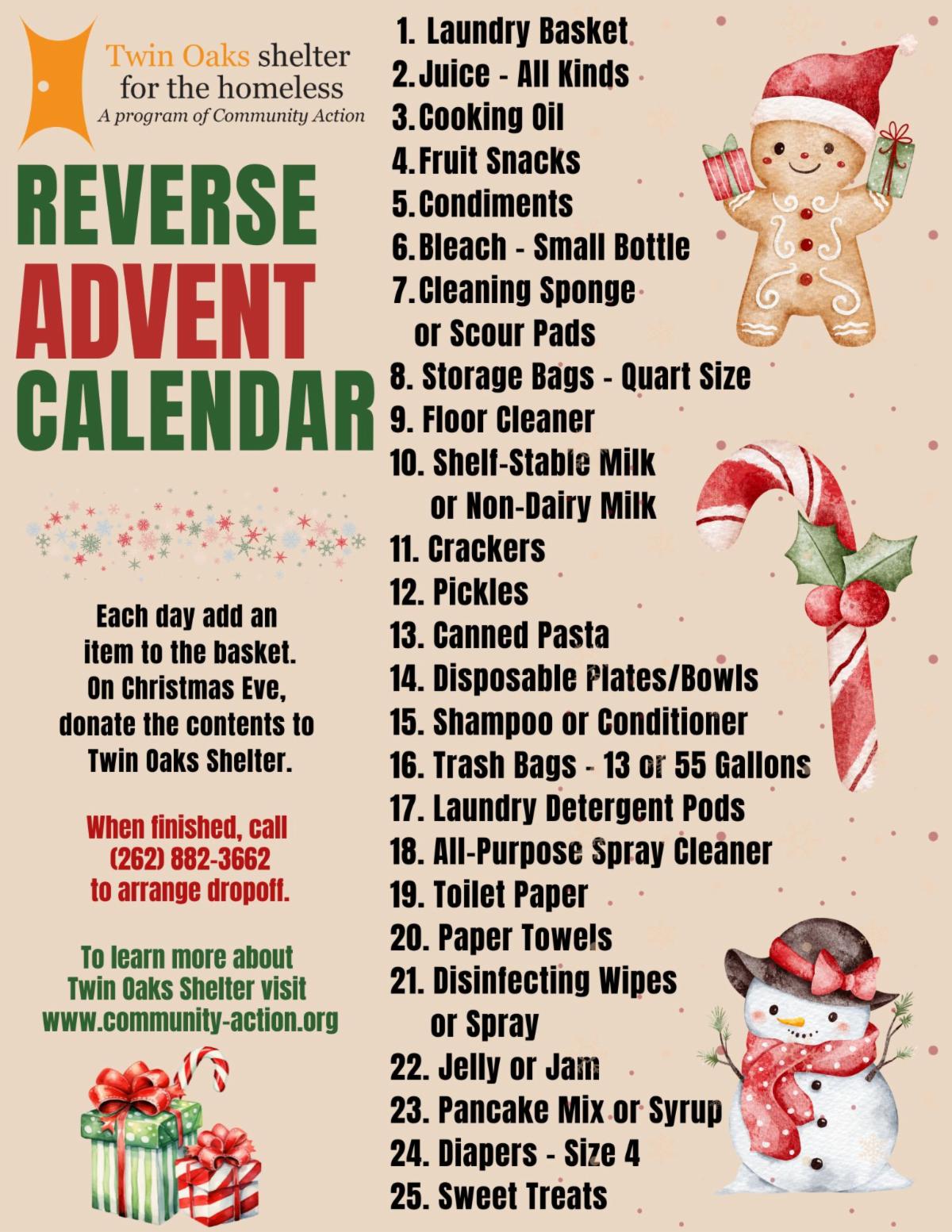 This holiday season, let’s flip the script on the traditional advent calendar! Instead of receiving a treat each day, we invite you to give one — by placing a daily item into a laundry basket for our shelter.