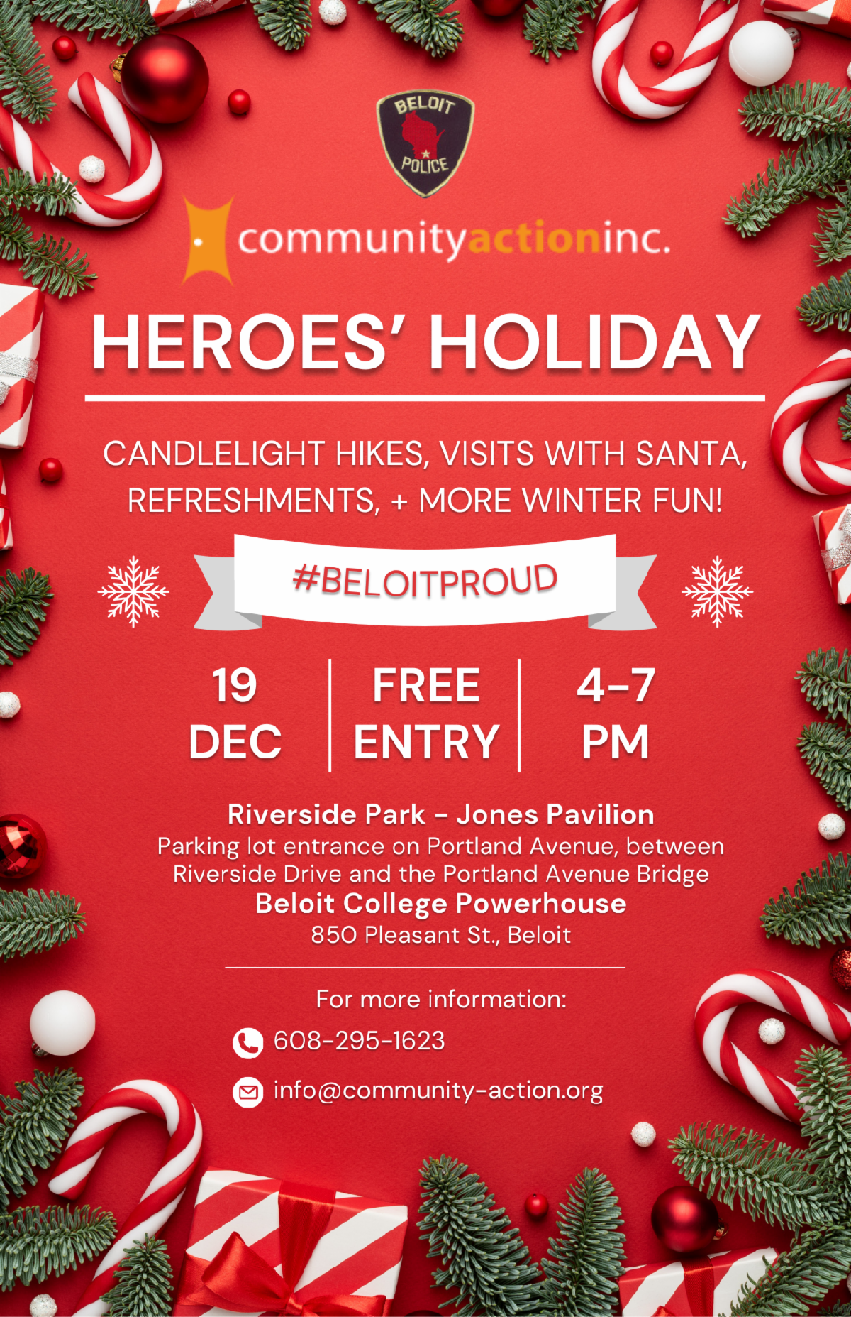 Join us for a free, family-friendly holiday party on Friday, December 19, from 4–7 PM at the Jones Pavilion and Beloit Powerhouse.
