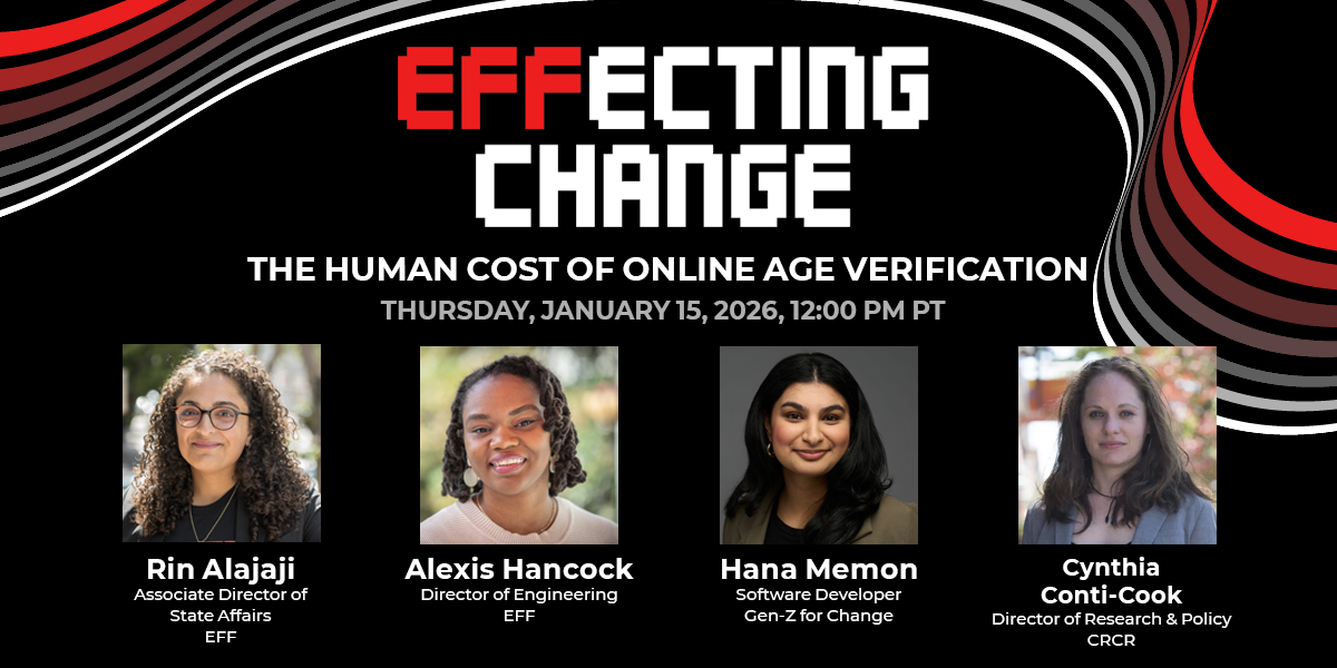 Join us on Thursday, January 15 at 12:00 PM Pacific for the latest installment of our EFFecting Change Livestream Series: The Human Cost of Online Age Verification.