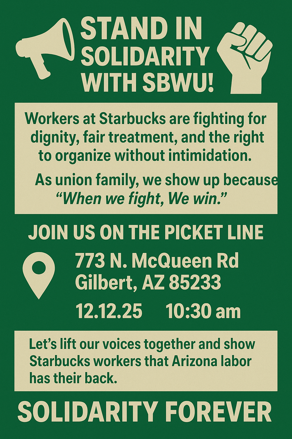 Starbucks workers across the country are taking a stand. We invite you to join us as we stand with Gilbert, Arizona, Starbucks Baristas at the picket line tomorrow as they fight to secure contracts that protect their rights and safety.