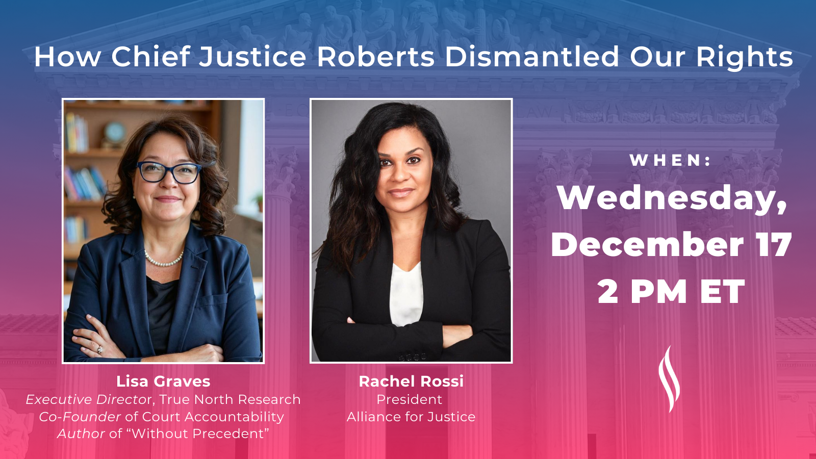 We are excited to invite you to an important discussion, Holding Court: How Chief Justice Roberts Dismantled Our Rights, taking place on Wednesday, December 17, 2025, at 2 PM ET. Join us for a conversation with Lisa Graves, Executive Director of True North Research, co-founder of Court Accountability, and author of the new book, Without Precedent: How Chief Justice Roberts and His Accomplices Rewrote the Constitution and Dismantled Our Rights. AFJ President Rachel Rossi will be moderating the discussion.