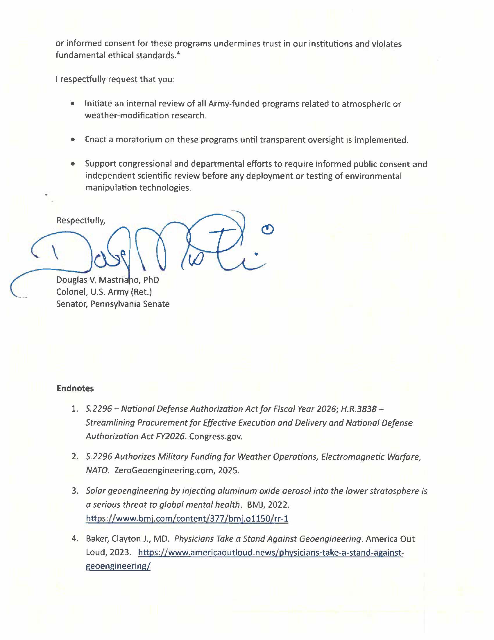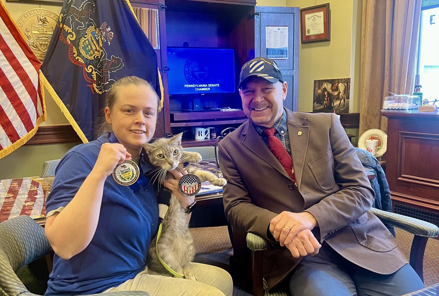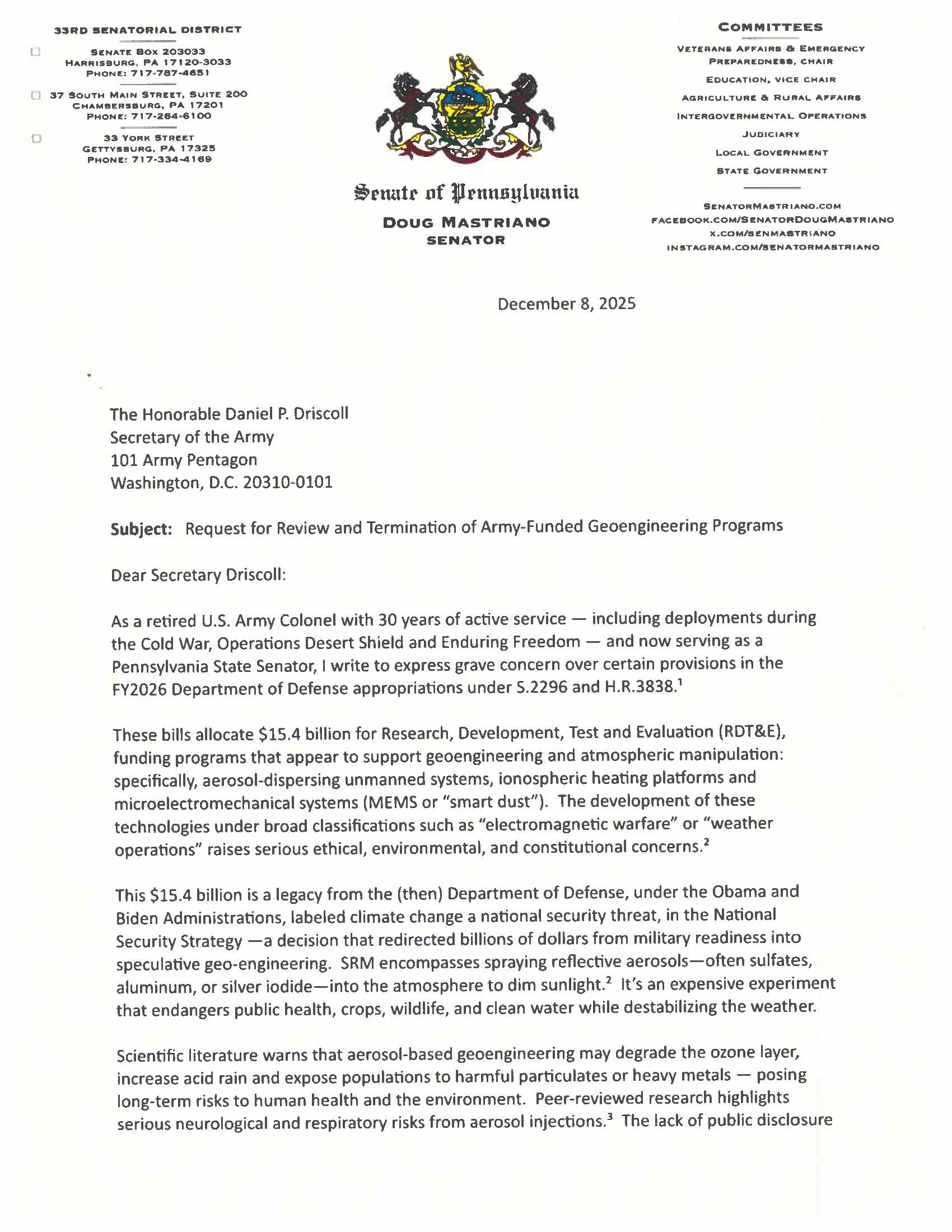 There is nothing extreme about asking for documentation when more than $1.3 million in taxpayer dollars are spent on a governor’s private home. Pennsylvania taxpayers deserve answers: What was done? Why was it necessary? And why was it hidden? This is public money — not campaign funds, not discretionary cash and certainly not a private renovation budget. At a time when grocery bills are up, energy costs are climbing and families are struggling to afford basic necessities, watching $1.3 million vanish into undisclosed construction at a private residence is not just tone-deaf — it’s insulting. Shapiro has cultivated a brand of transparency, competence and public stewardship. But transparency is not a slogan. It is a practice. And right now, that practice is nowhere to be found. This controversy is not about partisanship. It’s about stewardship. It’s about whether we still believe elected officials owe their constituents honesty — especially when taxpayers are the ones footing the bill. If we do, we must reexamine whether current law is enough to protect both the governor and taxpayers at the same time. Pennsylvanians deserve better than secrecy. They deserve better than evasive answers. And they certainly deserve better than unauthorized spending on private property with no oversight. It’s time for Shapiro to come clean. Release the assessments. Release the invoices. Release the records. And restore the trust that was compromised the moment this spending was concealed. Oversight is not optional. Transparency is not a burden. It is the minimum standard for anyone who serves the people of this commonwealth. Honoring Mr. Tipler for His ServiceI had the privilege of recognizing Mr. Tipler for his many years of dedicated service to our community as a Fire Police Captain. His commitment to protecting others has left a lasting impact on countless families across the county. Mr. Tipler is also a proud Vietnam veteran of the 1st & 7th Cavalry, where he bravely served our nation. He now faces significant health challenges due to Agent Orange exposure, yet continues to embody courage, resilience, and service. It was an honor to express our deep gratitude for his sacrifice, leadership, and unwavering dedication to others. Please join us in thanking Mr. Tipler for a lifetime of service. Recognizing Therapy Cat, ChaseI had the incredible honor of presenting Therapy Cat Chase and his owner, Gwyneth, with Pennsylvania Freedom Medals in recognition of all the amazing work they’ve done across the Commonwealth. This is a huge moment for therapy cats everywhere, and a wonderful reminder of the comfort and healing these animals bring to so many people. Congratulations to Chase & Gwyneth! My letter to Secretary Driscoll regarding Geoengineering ProgramsMy letter to Secretary Driscoll about the Request for Review and Termination of Army-Funded Geoengineering Programs Tax Relief for Working Pennsylvanians