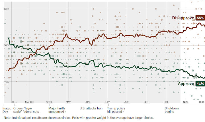 A Disaster for Trumpian AuthoritarianismAdequately examining what happened in the thirty days that hath November to show the American tide is turning decisively against the Trump Delusion would require a book and I am busy writing a different one. Here, I’ll just quickly review some of what went wrong for Trump and his minions (and therefore went right for America) in the span of four weeks and two days. The off-year elections held on November 3 constituted a massive repudiation of what has become the Anti-Republic Party. The three most-watched contests—gubernatorial races in Virginia and New Jersey and the mayoral race in New York City—all produced massive victories for Democrats—and Democrats of very different sorts. It wasn’t just the wins, but the margins of victory. If you look at the AP map of the election in Virginia, every county in Virginia, including the very “red” ones, moved towards the Democrats. The same was the case in New Jersey. And so it was across the nation. Democrats won judicial elections in Pennsylvania and Georgia. They won seats in the state legislature in … Mississippi! They won local elections—for school boards, town councils, and so forth—just about everywhere, and in the few cases where they didn’t win, they narrowed the margin substantially. I don’t know whether dog catchers are elected anywhere anymore, but if they were, it’s a safe bet that it will be a Democrat catching dogs before Kristi Noem can shoot them. In New York City, Democratic Socialist Zohran Mamdani won handily and stimulated the highest turnout in a mayoral election since 1969. He showed Democrats nationally how to campaign in ways that attract new and young voters. Nationwide, young voters, including young men, who had been gravitating toward Trump and his party, moved sharply to the Democrats. In California, an election without candidates drew a huge turnout to vote for a plan to gerrymander California seats in the U.S. House for Democrats temporarily to the counter the Texas gerrymander intended to get five additional seats for Republicans. In five special elections for vacant House seats this year, three in very red districts and two in blue districts, Democrats gained an average of 16 to 17 points over the presidential vote last year. G. Elliott Morris of Strength in Numbers estimated for Heather Cox Richardson that at this point, “the 2026 midterms can be expected to see a swing of 7 to 8 points toward the Democrats.” Shutting Down the ShutdownDuring the month’s first ten days, the longest government shutdown in history continued. Polls showed that a substantial majority of Americans blamed Trump and Republicans. Democrats were holding out for a restoration of government subsidies to help people pay for health insurance. Then Trump refused to allow the use of a fund for such emergencies to continue food assistance programs. The idea seemed to be something along the lines of:Democrats don’t like people to go hungry and without healthcare. I don’t give a shit about them, so they’ll cave. If that was his strategy, it seemingly worked when a sufficient number of Senate Democrats agreed to reopen the government in exchange for a guarantee of a vote on health insurance in December. While there were good arguments on both sides for whether this was the way the Democrats should go, it appears that most voters got the message that Democrats care about people and Republicans don’t. For more on this, see my essay, “The Democratic Message Should Be Clear: We Care about people suffering; Republicans Couldn’t Care Less.” Meanwhile, Trump was solidifying his identification with the popular image of Marie Antoinette by having lavish parties for the rich and having hideous gold-plated crap put up all over the White House, not to mention knocking down the East Wing to put up a Versailles-like ballroom. Epstein, Epstein, EpsteinThe constant drumbeat accompanying the Trumpian slide in November was the demand to release the Epstein Files—and his desperate quest to stop them from coming out. After the Shutdown ended and Mike Johnson had to reopen the House and finally llet Arizona Rep. Adelita Grijalva be sworn in on November 12, it was clear that the discharge petition to get a vote on releasing the files would pass. At first, Trump put even more pressure on the Republicans who had signed it to reverse course, but they refused. He was finally left with no choice but having most Republicans go on record in opposition to exposing powerful pedophiles or let them all vote for it and try to keep secret whatever it is that he so fears is in the files from getting out. another way. He order his yes-woman Attorney General, Pam Bondi, to open an investigation of Democrats in the files, but not of Trump. The whole shabby performance has weakened the support for Trump in the MAGA/QAnon base. Rather than get into this matter more here, I’ll direct readers to my two-part essay on it, “Could THIS Be What Trump is Terrified There’s Proof of in the Epstein Files?”, available here: and here. I also highly recommend the outstanding essay Anand Giridharadas wrote in the New York Times after reading all the Epstein emails that have been released to this point, “How the Elite Behave When No One Is Watching: Inside the Epstein Emails.” Trump Falls Under Mamdani’s SpellOn November 21, Trump met at the White House with Mamdani, whom he had denounced as a “communist” among numerous other condemnations. When they emerged from the meeting for an Oval Office press conference, Trump seemed like a teenage girl who had fallen in love. Apparently totally smitten by the young, charismatic Muslim Democratic Socialist, Trump was agreeing with him on everything, joking with him, holding his hand, saying “I’ll be cheering for him,” said he was unconcerned that the mayor-elect refers to him as a fascist, that he thinks Mamdani will do a “great job” as mayor and he woul