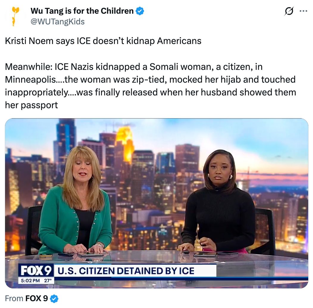 In another incident, a US-born citizen and Somali-American woman was running errands when she was randomly jumped by ICE agents and zip-tied. They mocked her for her religious attire, touched her inappropriately, and jailed her for over 24 hours. A US citizen, 24 hours in jail.