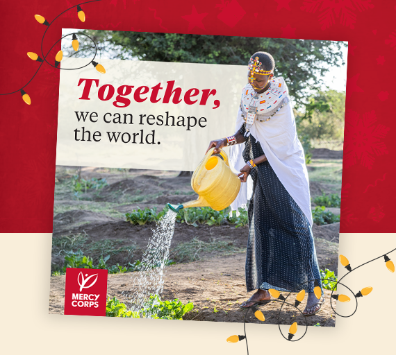 The beautiful photo depicts Selina, a mother in Kenya, watering the vegetables in her communal garden, which is supported by Mercy Corps. She is one of 28 women receiving training as part of a women’s group focused on agriculture, literacy, nutrition, and hygiene. Selina says that the women’s group has improved her and her family’s life in multiple ways. She has learned to read and write, and how to prepare healthier food for her children. She enjoys cooking the spinach that she learned to grow, and her kids have gotten healthier and stronger. Click here to send Selina’s inspiring story to your loved one with a holiday gift to Mercy Corps — and then follow these simple instructions: