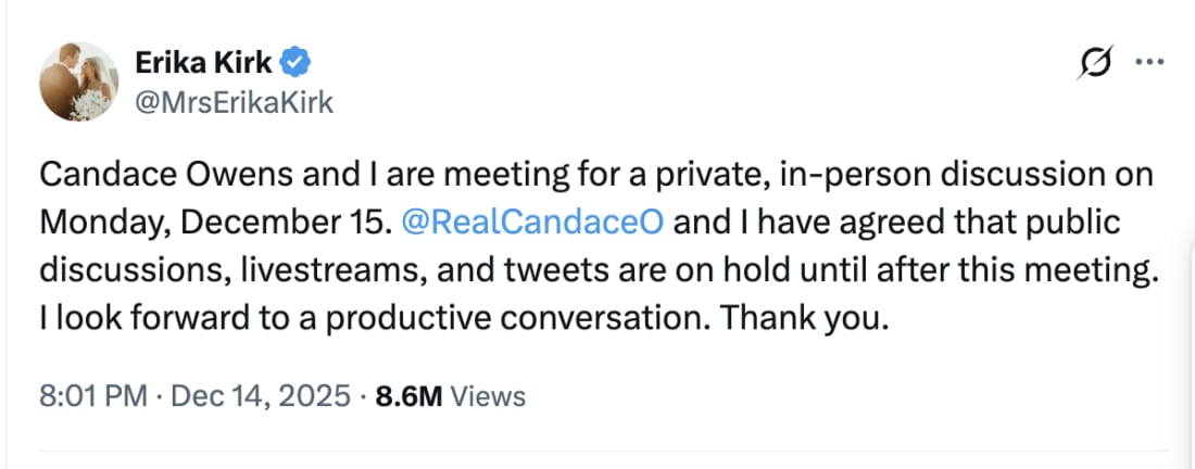 Erika Kirk announced on X Sunday that she and commentator Candace Owens will meet for a private, in-person discussion on December 15, marking the first direct conversation between the two after weeks of mounting tensions over conspiracy theories surrounding Charlie Kirk’s death, with both women agreeing to pause “public discussions, livestreams, and tweets” until after the meeting.