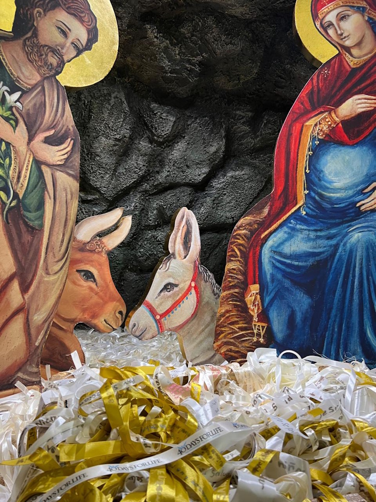 Working with 40 Days for Life volunteers, Costa Rican artist Paula Senoto designed a pro-life Nativity scene lined with ribbons instead of straw...