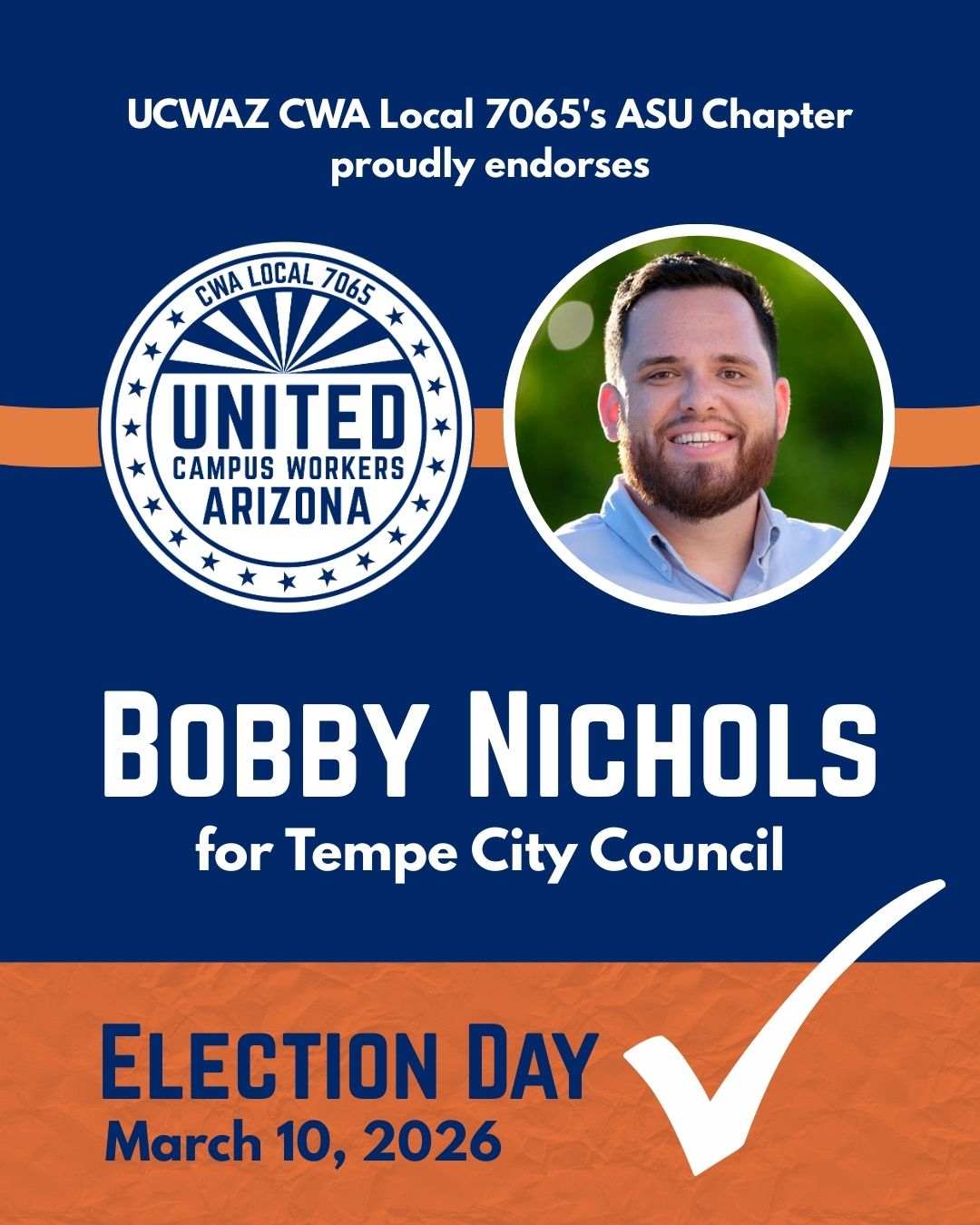 "The ASU Chapter of UCW-AZ is thrilled to endorse Bobby Nichols for Tempe City Council. Bobby has a proven record of standing in solidarity with workers across industries in Arizona not just in his words but in his actions. He has stood on picket lines and fought against Arizona’s 'right-to-work' laws. Mr. Nichols is a fierce ally to queer folks and people of color and has shown that he values the experiences of all sectors of the working class. Recently, Bobby was one of the main organizers behind the movement that forced Tempe City Council to rescind the 30-person restriction in public parks ordinance (O2025.25). He has organized actions to speak out against evictions by corporate development and supports rent control. When elected, Bobby plans to introduce legislation that would provide free municipal childcare and city-run grocery stores, among other initiatives. Join us in voting for Bobby Nichols for Tempe City Council on March 10th, 2026."