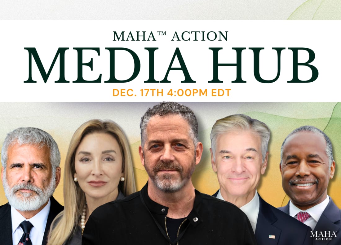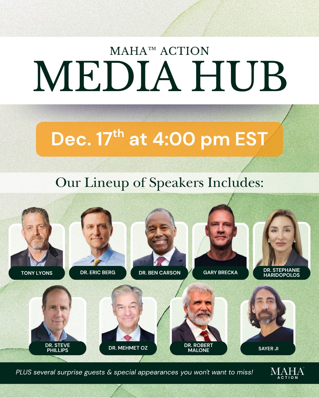 Please join us on Wednesday, December 17, from 4pm - 5pm Eastern, for the MAHA Action Media Hub, featuring some of the most influential scientists, policy makers, nutritionists, and clinicians in the nation. This event will cover a wide range of recent developments in the world of MAHA, including a radical new approach to researching and treating Lyme disease, the recently announced federal regenerative agriculture initiative, and more! The program features MAHA Action president and host, Tony Lyons; CMS administrator and cardiothoracic surgeon, Dr. Mehmet Oz; HHS Chief of Staff and advisor, Dr. Stephanie Haridopolos; zoonotic infections expert and physician, Dr. Steve Phillips; immunologist and researcher, Michal Caspi Tal, PhD; National Advisor for Nutrition, Health, and Housing at the USDA, Dr. Ben Carson; author and keto expert, Dr. Eric Berg; ACIP scientist, professor, and physician, Dr. Robert Malone; investigative journalist and natural health researcher, Sayer Ji; and biohacker and human performance specialist, Gary Brecka. To attend our media hub, simply click the free registration link here. All of our Media Hub events are open to the public and the press. We hope to see you Weds@4pm!! Thank you for subscribing to The MAHA Report You can follow us at: TheMAHA_Report on X You can also follow us at: MAHA Action on Facebook Make America Healthy Again™ and MAHA™ are trademarks owned by MAHA TM LLC |