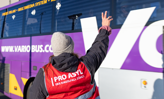 Headerbild: Eine Mitarbeiterin von PRO ASYL vor den Bussen der ankommenden Geflüchteten.