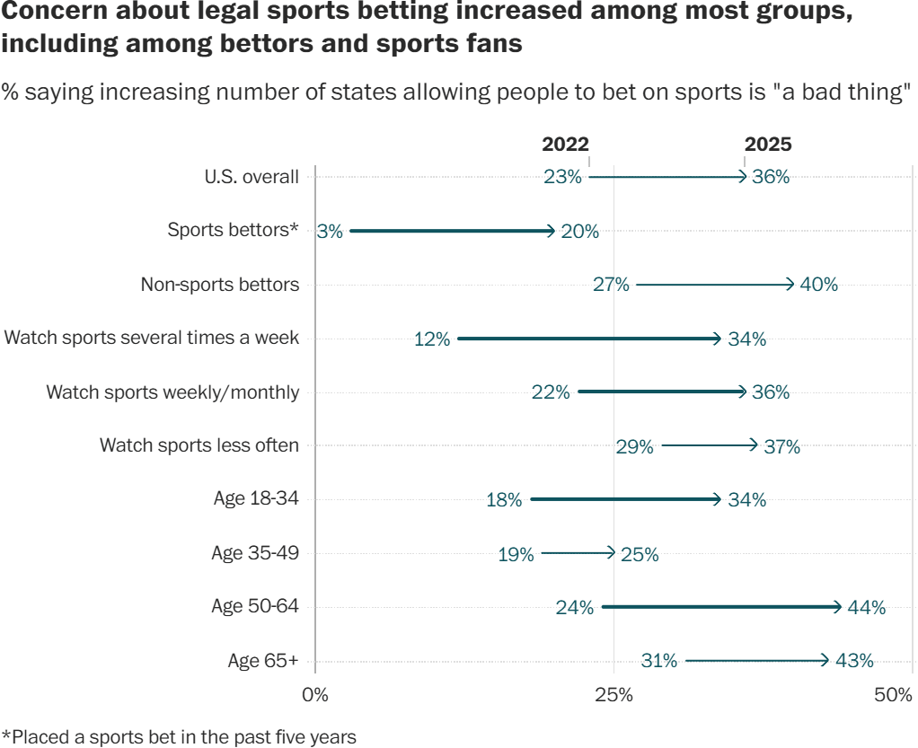 Public opinion is turning against sports gamblingThe public is starting to notice just how bad companies like FanDuel and DraftKings are.This is a follow-up to what I wrote two weeks ago. And because it’s not a partisan issue, there’s a chance for Democrats and Republicans to come together to address this growing crisis. In case you missed it, here’s what I wrote: I flew into the St. Louis airport a few nights ago and was immediately hit with more sports gambling ads.¹ Because I am extremely on-record acknowledging that online sports gambling is bad, I have friends sending me these sorts of ads all the time now.² They’re inescapable. But if you’ve been paying attention to the news lately, what you’ll notice: a recent groundswell of coverage on the negative impact that sports gambling is having on communities, especially on boys and young men. Public opinion is finally shifting, and I’m optimistic that in a few years there may be an opportunity to limit the damage that companies like FanDuel and DraftKings are causing. Here’s a roundup on what I’ve been reading on the topic. Americans are increasingly skeptical of online gambling and sports gamblingThe Washington Post recently ran a poll that shows Americans’ growing concerns about sports gambling. In May 2022, 23% of Americans said states allowing people to bet on sports was “a bad thing.” As of earlier this month, that number has grown to 36%. (A plurality, 49%, say that it’s “neither good nor bad.”) What’s interesting: every group measured increasingly thinks that sports gambling is bad, relative to what they believed in 2022. What I find most notable is that the people most exposed to this—the gamblers themselves and sports fans generally—are some of the people who’ve moved the most on this issue in the last 3.5 years. Today, relative to 2022: