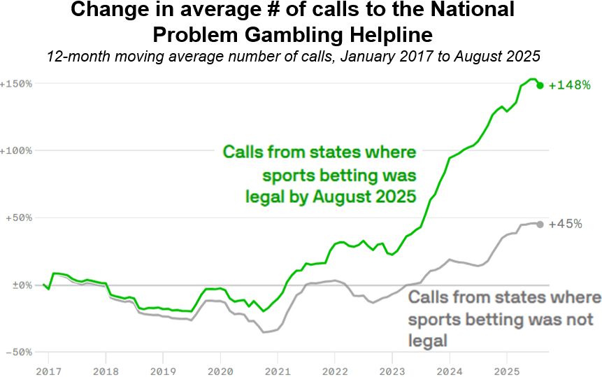 Because it’s been a staggered legalization from one state to the next, we can more clearly see the impact in states where there’s gambling vs. states where there’s not. In short: gambling addiction—because of illegal markets, crypto, and national ads—is up everywhere. But it’s way up in states where online gambling has been legalized: