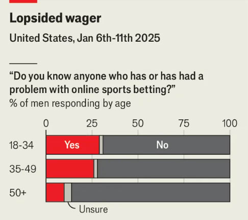What this means: it’s incumbent upon those of us who are most impacted, and those of us whose friends are most impacted, to keep speaking up. It’s why I’m still writing about this, and why I will continue to do so. Feel free to share this post with someone who will find this interesting. If you’re reading this email because someone sent it to you, please consider subscribing. 1 2 That’s not to say that I want you to stop sending them to me, by the way. I find them interesting and motivating. Keep them coming! 3 Further context: relative to people ages 18-22, far fewer people in the general population are problem gamblers. As few as 2% of people over 55 are problem gamblers, according to the National Council on Problem Gambling. 4 I’m holding onto this designation for the last few years that I’m younger than the median American, thank you very much! 5