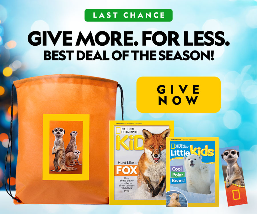Your gift options include: • Nat Geo Little Kids magazine annual subscription • Six Nat Geo Little Kids Early-Reader Books • PLUS: 2 bonus issues Two FREE bonus gifts: • Meerkat Drawstring Bag • Meerkat Bookmark