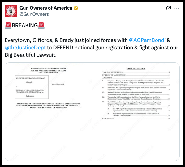 John, You won’t believe who’s now defending a federal gun registration system in court. Not just the Department of Justice, but the biggest gun‑control groups in America: Brady, Giffords, and Everytown for Gun Safety. They literally filed a brief supporting the DOJ’s defense of national gun registration and are attacking our One, Big, Beautiful Lawsuit. |